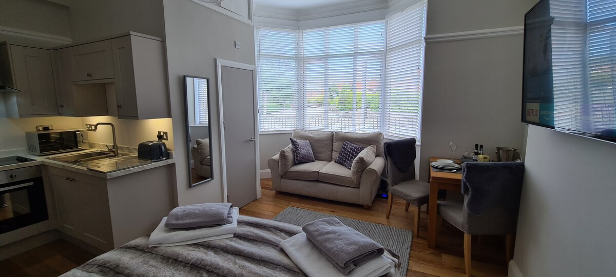 Samostojeći studio apartman, odvojen od glavne kuće koja se nalazi na velškoj priobalnoj stazi „Vešernica“ nalazi se u selu Deganvi. Na samo nekoliko metara od plaže, železničke stanice, autobusa, kafića, restorana i hotela Salubrious Quays Spa, savršena lokacija za posmatranje veličanstvenih zalazaka sunca. Studio sadrži sve što vam je potrebno za malu čajnu kuhinju, frižider, kuvalo za vodu, peglu, dasku za peglanje. Odvojite tuš-kabinu sa umivaonikom i WC školjkom.