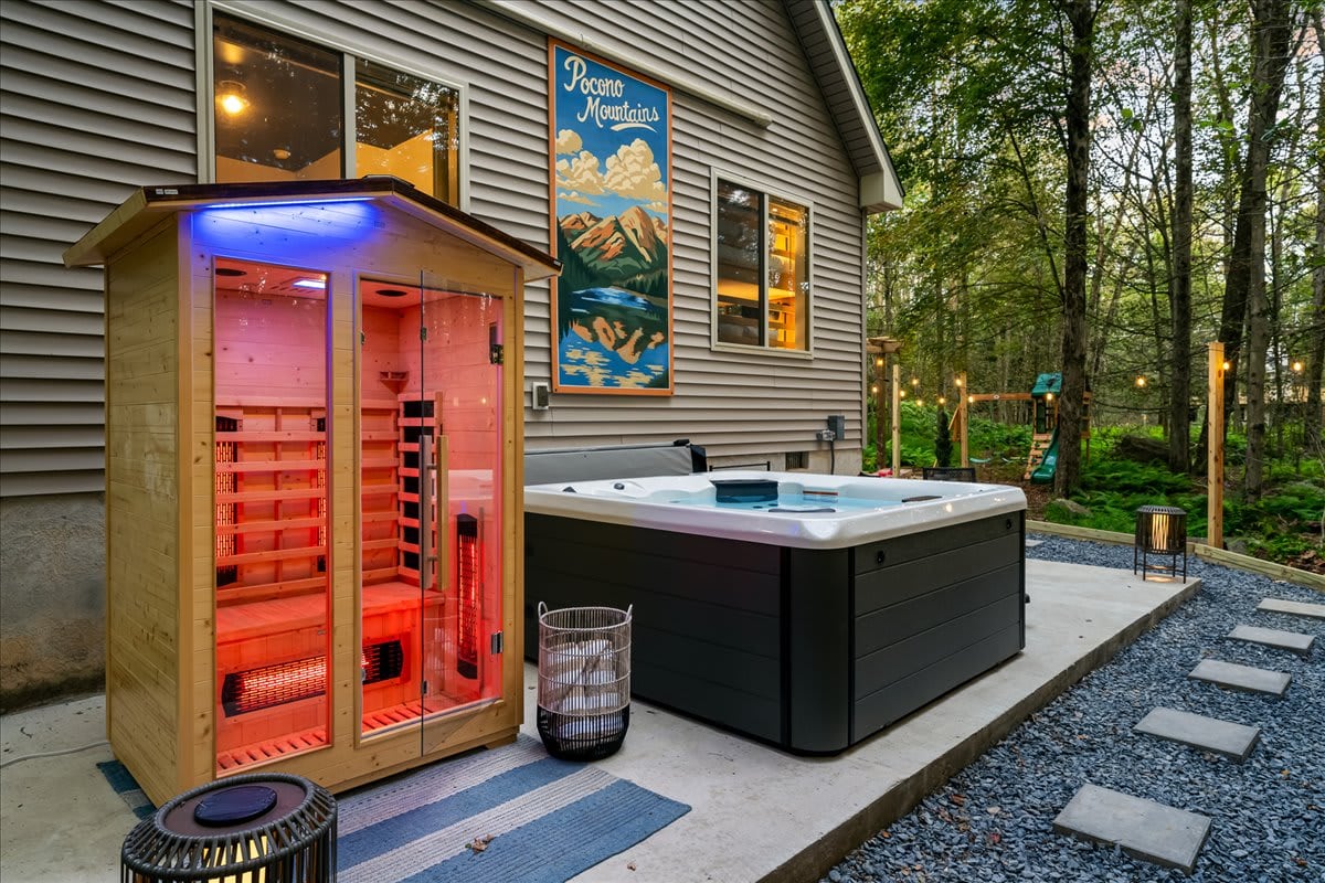 Latitude Adjustment is a unique retreat in Pocono Lake, designed for those who seek the perfect blend of relaxation and local exploration. Equipped with an amazing 4person outdoor steam sauna, a private 7person hot tub featuring waterfall, Bluetooth speakers, and LED lights, huge game room with 65” TV, wood burning stove, large outdoor entertaining area with a grill, fire pit, guest shed and dining area. Located in a beautiful, amenity-rich Arrowhead Lake community, 1 minute walk to the lake!