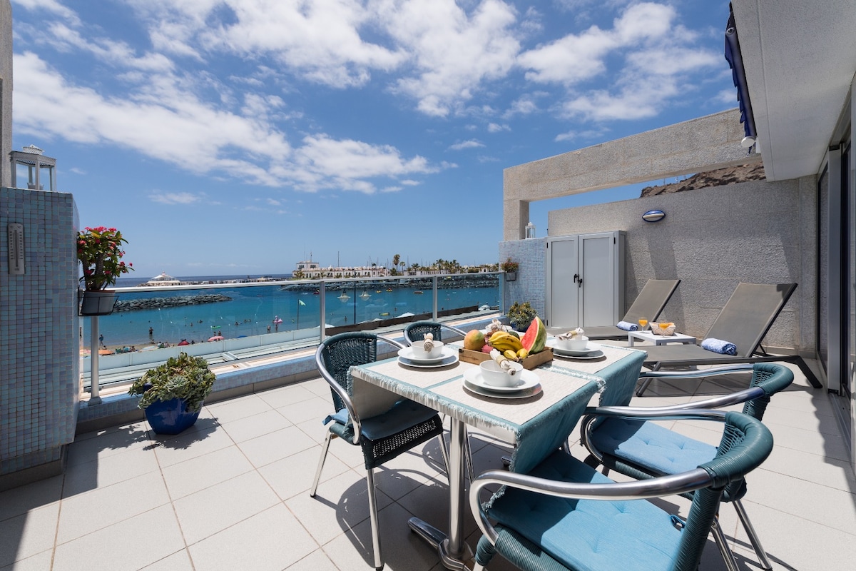 Casa Perla is a unique 3-bedroom apartment in charming old fishing village of Puerto de Mogan, a true paradise, with easy access (few steps to front door) and only 50 m to the beach. Total 150m2 with amazing sea view terrace with all amenities, outdoor kitchen + barbeque and a lounge bed. Authentic Spanish house mixed with Mediterranean bright colors. Newly renovated 2025. Offers filtered drinkable water from the tab. Air-condition in all rooms and fans. Best restaurants are few steps away.