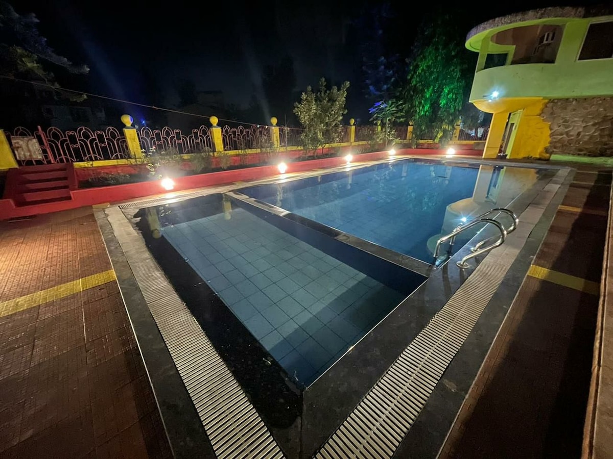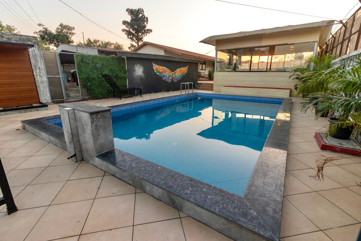 10 mins drive from Lonavala exit of Expressway but away from the bustle. The house is located close to the Swami Samarth Temple. Newly renovated 2 Beds,a huge living room 3 baths and with sleeping arrangements for 6. Enjoy your stay with a huge swimming 🏊♀️ pool A Good exterior place to chill out and enjoy your barbeque/food & drinks. The kitchen is equipped with basic amenities,We provide good homely food Veg / Non Veg live bbq on chargeable basis