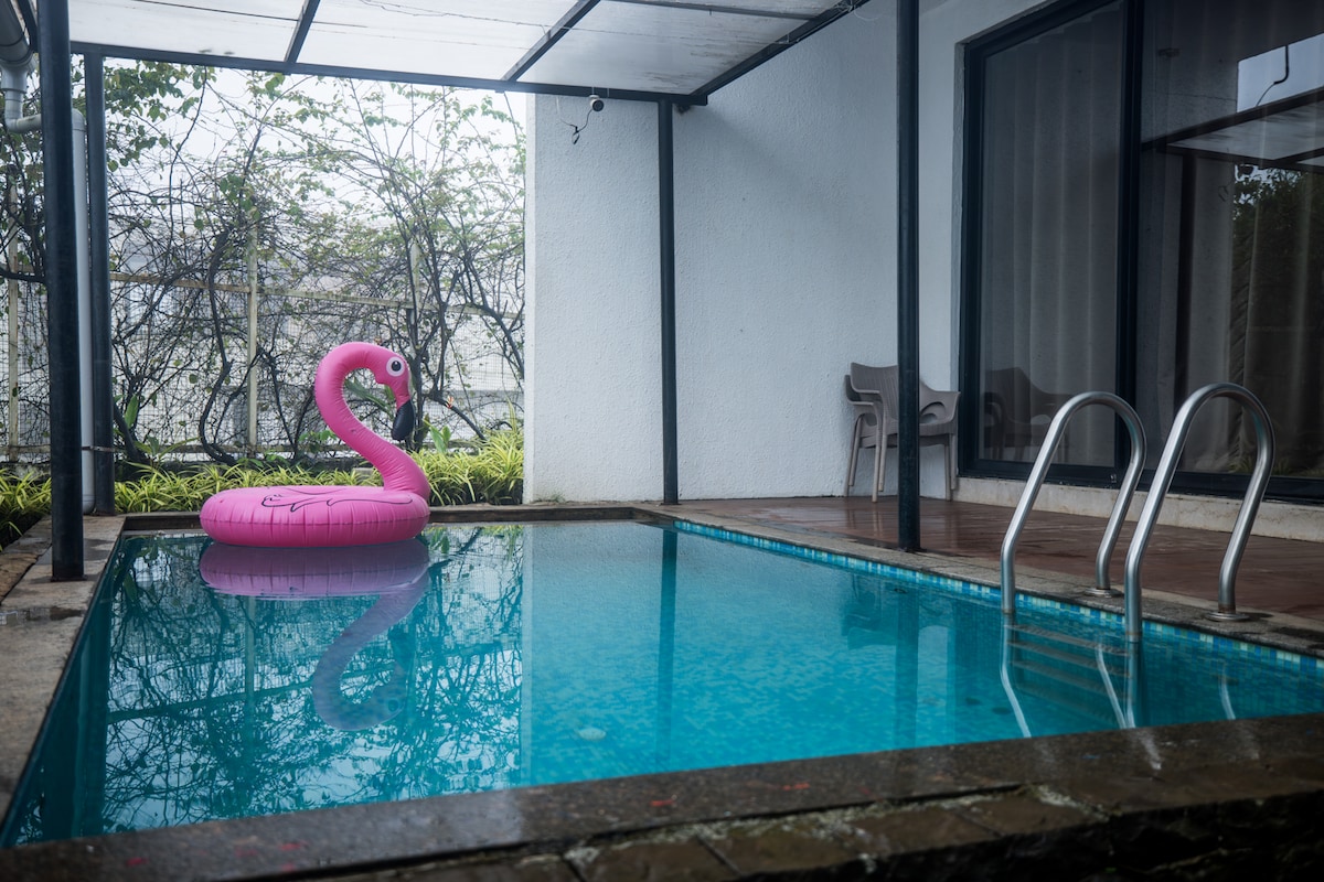 ◆ Located within a secure gated complex ◆ Nearby attractions: ✔ Bushi Dam – 20 km ✔ Jain Temple – 5 km ◆ Elegant 3-BHK villa perfect for large groups ◆ Bright living room with plush recliner, elegant decor & indoor plants ◆ Entertainment zone with Marshall speaker & stylish TV unit ◆ Private pool for refreshing dips ◆ Poolside loungers for relaxing under the sun ◆ Garden swing for a peaceful break ◆ Serene ambiance, ideal for reading or unwinding