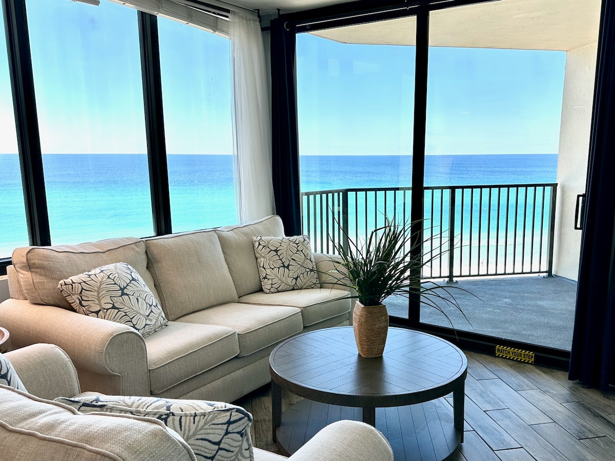 This GULF FRONT BEACH condo has a style all its own. Long Beach is a gated community and features the longest stretch of sand in PCB. This newly renovated condominium on the 7th floor has panoramic views of the Gulf from every room . Spanish-style ceramic tile floors & premium granite countertops throughout. The huge curved balcony attracts spectacular sunsets. The resort has low occupancy so the super-fast elevators won't leave you waiting. The resort has a 25 yo age minimum in order to book.