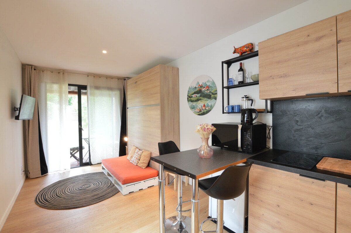 Novi, potpuno opremljeni studio. spavaća soba sa bračnim krevetom, opremljena kuhinja i sto za 4 osobe. kupatilo i WC šolju. topao i moderan dekor. nalazi se na desnoj obali reke Garone, 4 kilometra nizvodno od Bordoa, 5 minuta od tramvaja, 2 minuta autobusom do centra Bordoa i 5 minuta od brodova koji vas vode do muzeja Cité du Vin, Miroir d'eau, centra Bordoa.