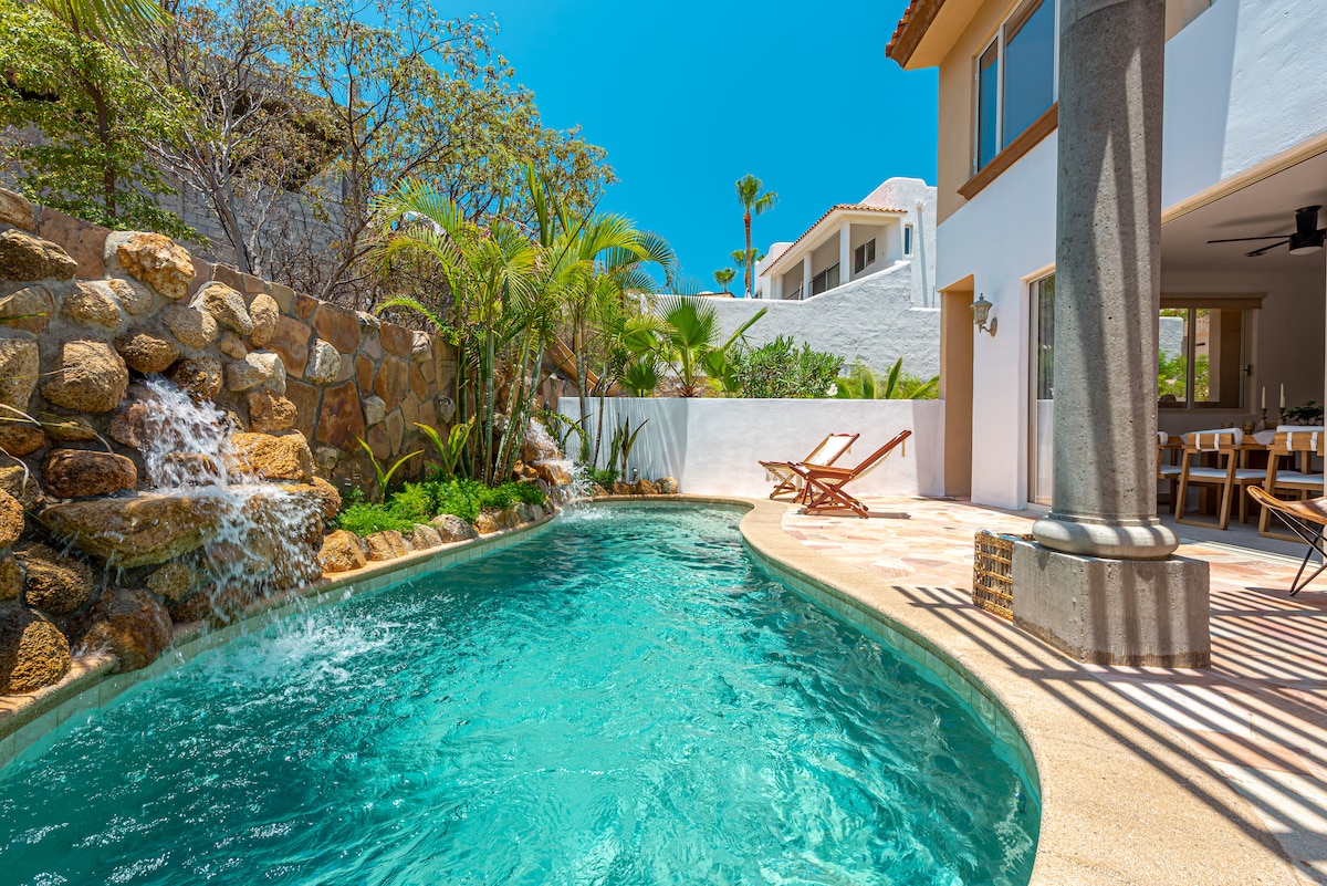 Relax, explore, and feel at home in this colorful private villa inside Pedregal, Cabo’s most exclusive gated community with 24/7 security. This stylish home has 4 bedroom suites. Enjoy ocean, marina, pool, beach and mountain views from your private terrace, unwind by the saltwater pool, or dine outdoors under the shaded patio. Just a 10-minute walk to a beach, downtown and the Marina, this home blends privacy, comfort, and unforgettable Baja scenery.....this is the vacation life!