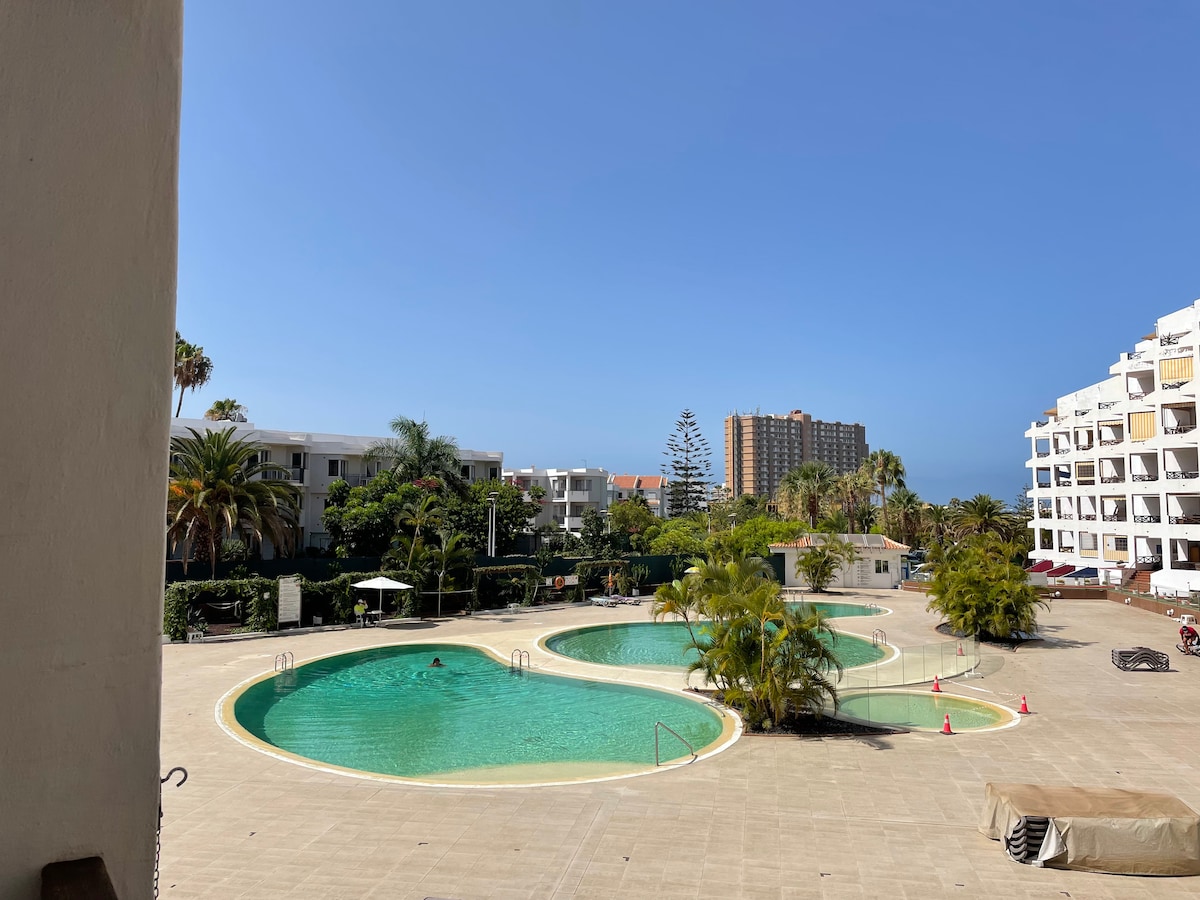 Pitajte me za posebnu cijenu! Udoban stan s pogledom na bazen. Nalazi se samo 3 minuta od mora. U blizini plaža Las Vistas i Los Tarajales. Ima veliki bazen sa besplatnim sunčalištem. Supermarket je otvoren svakog dana, a apoteka 50 mtrs. Samo 10 minuta od autobuske stanice i 15 km od aerodroma Tenerife Sur. Stan ima dnevni boravak, opremljenu kuhinju, kupatilo, mašinu za veš, spavaću sobu, terasu i Wi-Fi. Lijepo za dvije osobe koje putuju same.