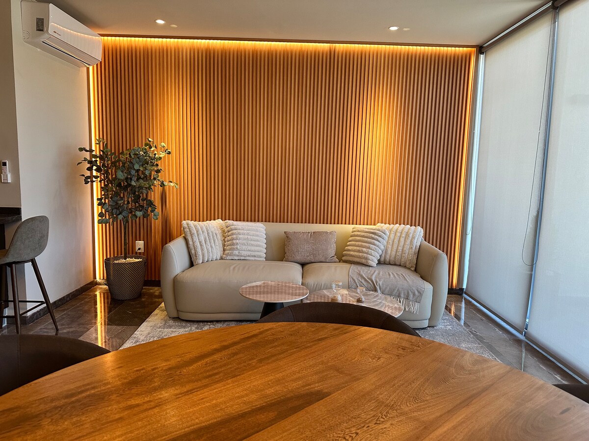 Relájate en este espacio tranquilo y elegante. Estás a unos pasos de Punto sur y Lifestyle Center: Cine, casinos, restaurantes, bares, tiendas de ropa y más. Tenemos acceso controlado para tu seguridad, estacionamiento privado techado y estacionamiento para invitados. 2 habitaciones, 2 baños completos, sala, comedor, centro de lavado, balcón y aire acondicionado con vistas increíbles en el atardecer y vista al bosque de la primavera. En el complejo hay alberca, terraza, área de juegos y más