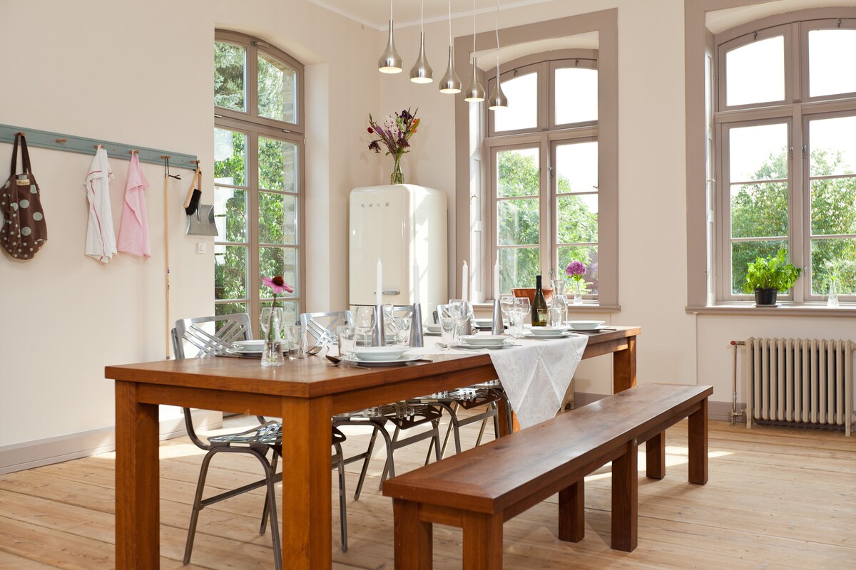 ✨ Historic manor house with sauna, fireplace, and 6,000 sqm garden ✨ ➝ Stylish apartment at Lexow Manor House ➝ Up to 8 guests—perfect for families and groups ➝ 4 bedrooms and 3.5 bathrooms ➝ Large living area with fireplace ➝ 6,000 sqm garden with fire pit ➝ Outdoor sauna for 6–8 people ➝ Barbecue facilities & seating areas in the garden ➝ Child-friendly with table tennis, trampoline & sandpit ➝ Dogs welcome ➝ Excellent WiFi throughout the house ➝ Electric charging stations