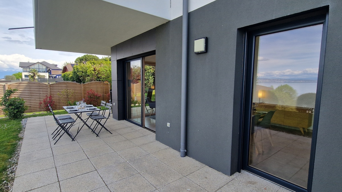 Stan u prizemlju kuće s panoramskim pogledom na Ženevsko jezero. Idealno za porodice, u blizini vinograda i pješačkih staza. 20 minuta od skijaških odmarališta Tolon-le-Memiz i Berneks, 50 minuta od Avorijaza i Šatela. Ako tražite mir i idilično okruženje na 5 minuta od Evijana i Tonona, naš smeštaj je pravi izbor za vas! Uživajte u prekrasnom, svijetlom dnevnom boravku i terasi s pogledom na jezero. Posteljina i peškiri su obezbijeđeni.