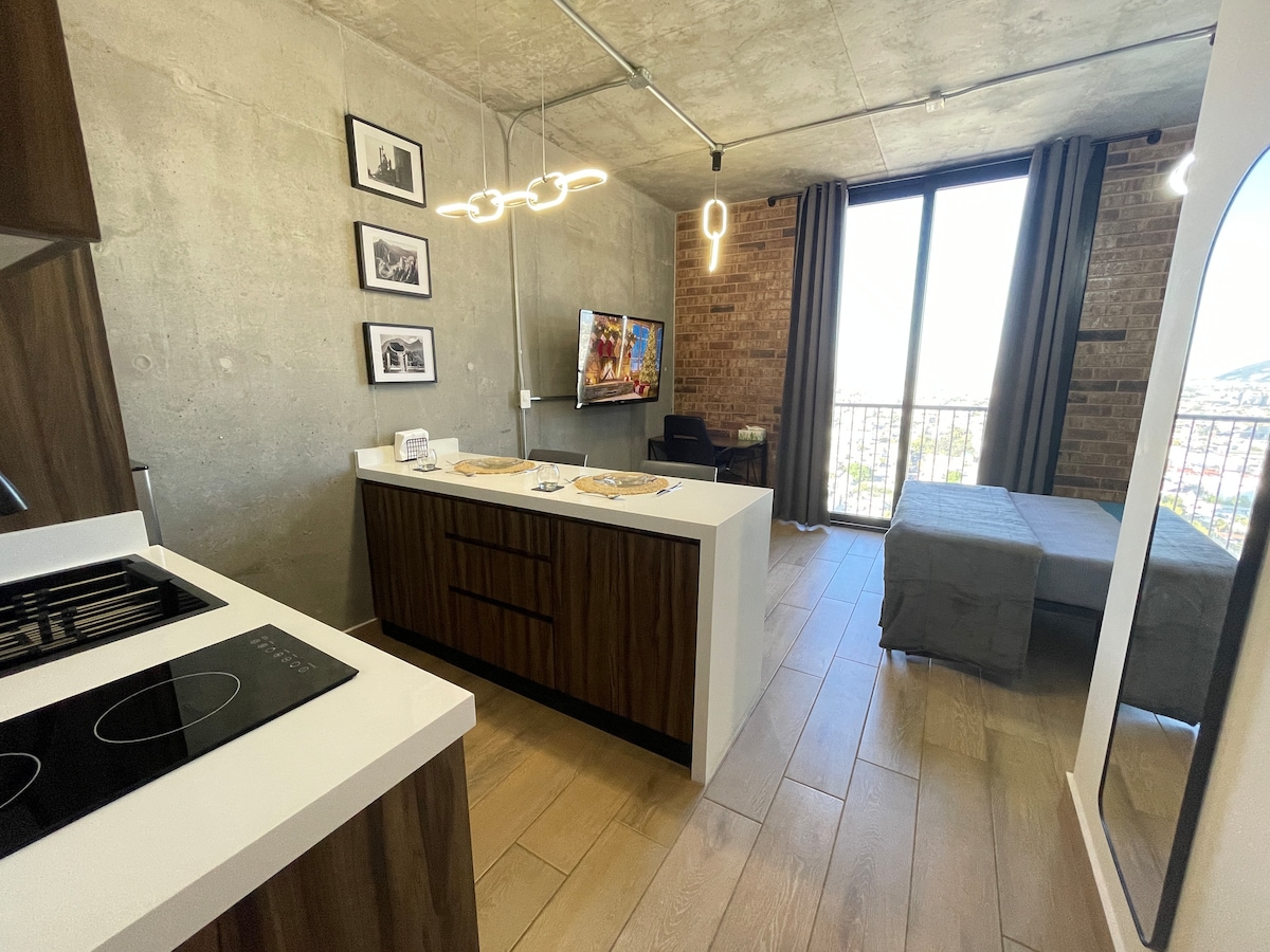 Predivno POTKROVLJE sa bračnim krevetom u centru Montereja u Barrio Antiguu. Izuzetno udoban za razgledanje, poslovnu posjetu ili obradu u cas Montereju. Centralna i bezbjedna zgrada sa odličnim pogledom i prvoklasnim sadržajima kao što su coworking prostor, teretana, bazen na 30. spratu s pogledom na brdo privilegovane stolice, bioskopska soba, roštilj, igraonica. • Brzi WiFi • 75-inčni OLED pametni ekran. • Radni sto. • Kuhinja je 100% opremljena.
