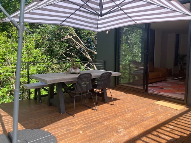 Described as a 'tree house' the apartment is light, airy and spacious (snug in winter) with ocean and bush views, located 5 minutes walk to the beach. It has a separate entrance and a large sunny deck overlooking lush native bush to the ocean below. There is no kitchen but there is a sink under cover on the deck & we provide a BBQ, microwave, bar fridge, kettle and toaster with essential crockery and cutlery. We provide guests with fresh coffee, tea, milk and home made muesli upon arrival.