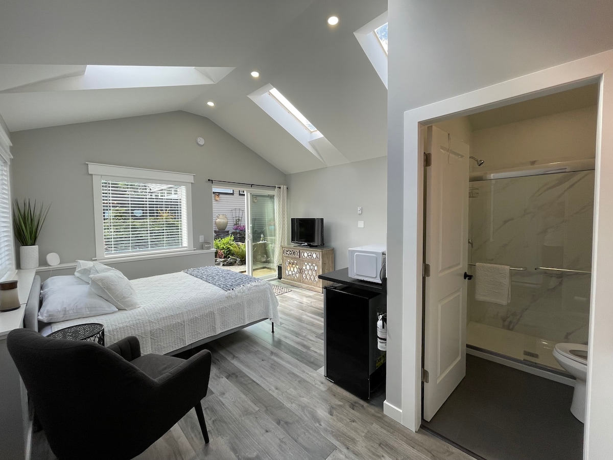 Licencirani čisti udoban mikro studio + privatno kupatilo i ulaz - jednostavna samostalna prijava, besplatan parking, krevet u punoj veličini (54" x 75", odgovara solo ili tankom duetu), u blizini centra grada, VIU, škola, bolnica, sportske arene, trajekti, 4 autobuske linije u blizini, zagrljeni prelepim parkovima i stazama, lep pogled na planine. vožnja 5 minuta ili šetnja 20 minuta do centra grada/rive/VIU, vožnja 10 minuta do zaliva Departure. Savet: rezervišite više noćenja da biste uštedeli na čišćenju jer se naplaćuje jednom po rezervaciji.