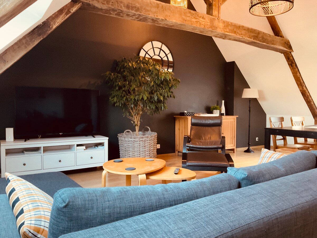 Stan „glava u zvijezdama” nalazi se na 2. i posljednjem spratu bez lifta, pod krovovima, u staroj kući, u srcu Bajea u vrlo mirnom okruženju. Može da ugosti 6 osoba. Sve prodavnice, muzeji i restorani su u šetnji. Bićete blizu plažama za sletanje (10 km od Arromanches). Uključen je privatni parking.