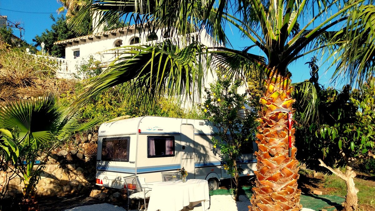 Držite se sebe – goli ili ne – ili uživajte u društvu 2 vrlo društvena domaćina, 2 tinejdžera i gomile vrlo ljudskih pasa: u kamp prikolici u bašti našeg doma u selu Almayate na 2,5 km od jedine netaknute plaže Costa del Sol, pola sata vožnje od Malage: Uživajte u najboljem od 2 svijeta: kampovanje + zajednički pristup svim proizvodima, uključujući bazen, ogromnu terasu s pogledom na more, spoljnu kuhinju s roštiljem, natkriveni trpezarijski i bilijarski sto na placu od 5.000 m ² punoj voća.