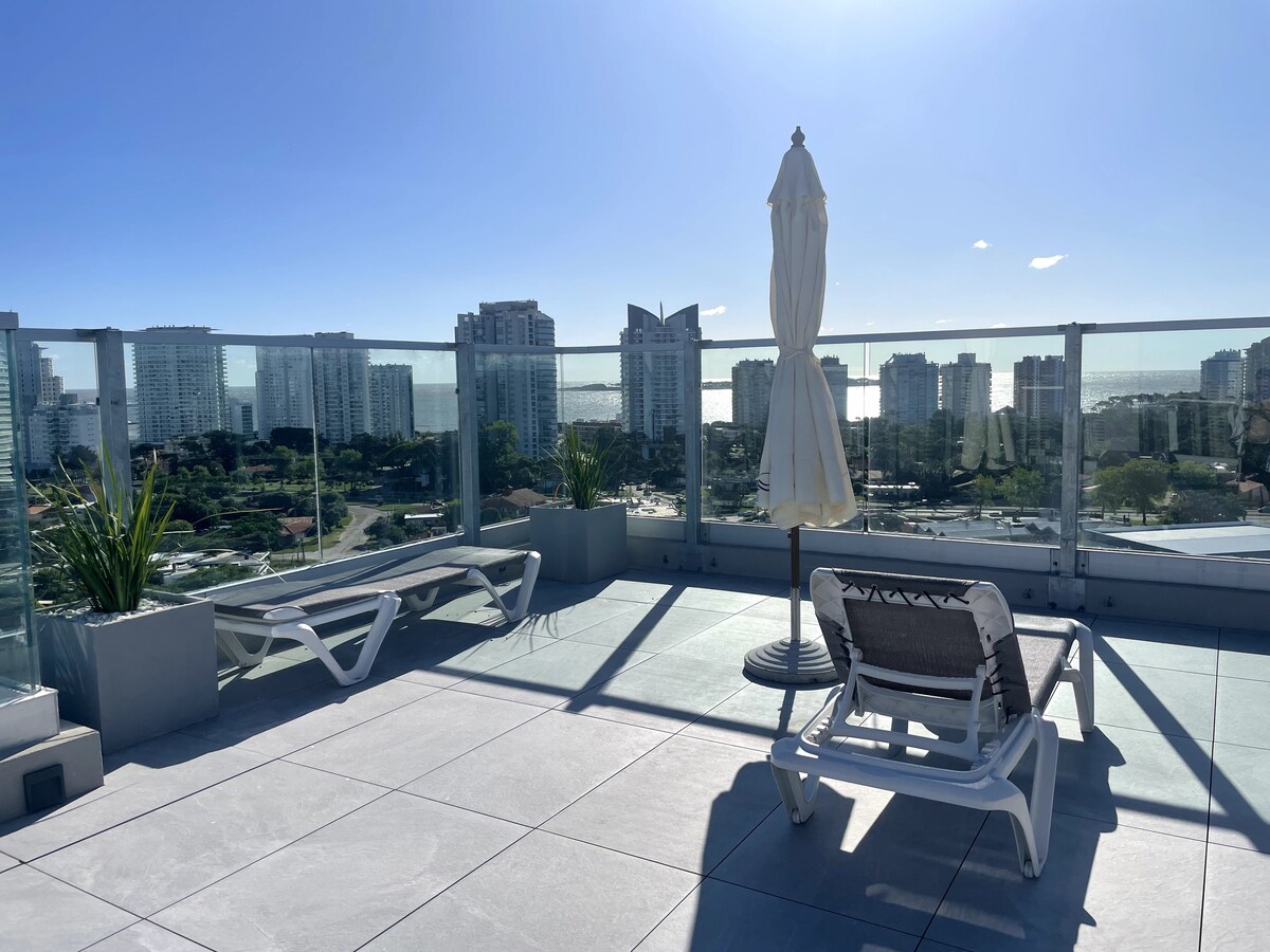 Prekrasan stan sa odličnim pogledom na more u tornju 1 2, koji se sastoji od dnevne sobe, 2 spavaće sobe (sve 2 en suite), 1 društvenog kupatila, pune kuhinje i velike terase. Zgrada ima roštilj, otvoreni bazen, zatvoreni bazen, đakuzi, teretanu, sobu za igre, višenamjenske terene, saune, vešernicu. Garaža. Potpuno opremljena. Nekoliko metara od dobre plaže, mansa plaže i Punta Shoppinga. Vratar i 24-časovni nadzor. La tv que posee es smart (netflix y youtube)