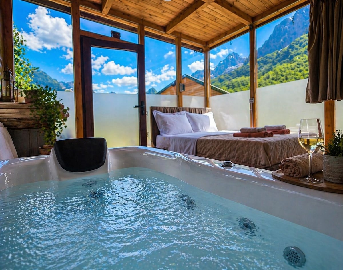 Postoje 4 predivne vile/brvnare tako da možete da se opustite sa celom porodicom na ovom mirnom mestu okruženom zadivljujućim pogledom. Ako ste strastveni planinar, tu je i mnogo mesta za šetnju u blizini, što je takođe odlična prilika da istražite i uživate u severnoameričkoj kulturi i kulinarstvu. Lokacija je privatna, usred prirode i potpuno povezana sa prirodom. Mesto ima privatni put i nalazi se 20 KM od Theth-a, 30km od Razema, 50 KM od Skadra,130KM od aerodroma Rinas.