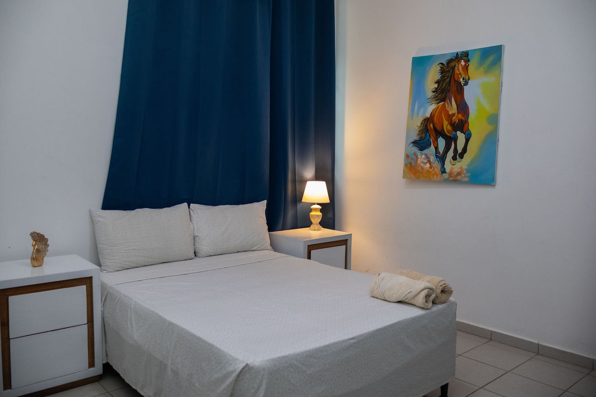 Dvokrevetna soba s ventilatorom u srcu Managve. Savršeno za parove ili putnike koji traže udobnost i cijenu u centru glavnog grada. Karakteristike: * Kapacitet: 2 osobe. * Kreveti: Ima 1 bračni krevet sa udobnim dušekom. * Kupatilo: Privatno i čisto kupatilo. * Sadržaji: ventilator. * Lokacija: Stambeni objekat El Dorado. Uživajte u energiji Managve i zajedničkim prostorijama našeg hostela.