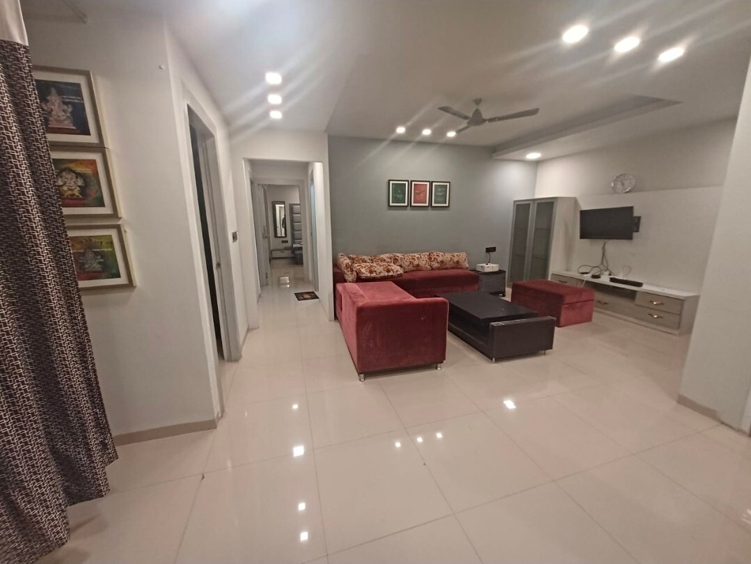 Forget your worries in this spacious 3000 sqft and serene space home,has a bright and modern feel, with polished tile floors and white walls throughout.A living area with a dark brownsofa, a dining area with a table and chairs, and a kitchen featuring white and dark cabinets. The bedrooms have large wardrobes, and there's also a balcony with a view of the surroundings. NOTE: PLEASE AVOID LOUD NOISE/MUSIC/ DANCE/ PARTYING as this flat is a part of society and Please strictly follow societyrules