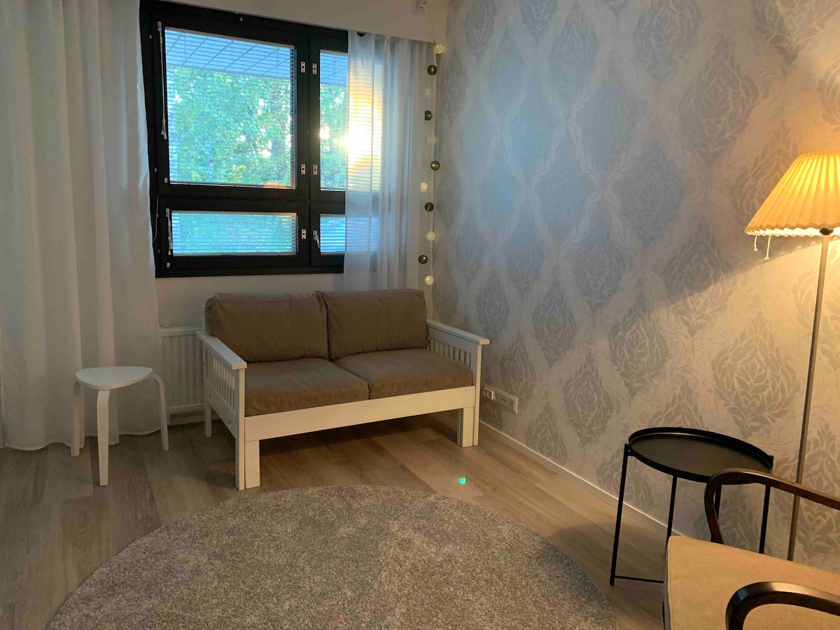 Lep stan u centru umetničkog grada Mänttä. Idealno za dvije osobe. Najviši sprat 7/7. Kuhinja sa posuđem i mogućnostima kuvanja (bez mašine za pranje sudova!), spavaća soba sa dva kreveta za jednu osobu. Standardno kupatilo sa tušem, dnevni boravak sa kaučem i TV-om. Lep balkon sa staklenim prozorima i pogledom na umetnički grad Mänttä, savršeno mesto za doručak!
