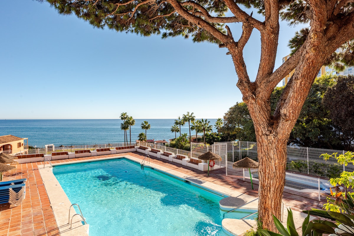 Cozy, bright, entirely renovated quality flat on the front line with sea views from the sunny and large balcony, both rooms and the bathroom. Features his and her shower, full kitchen, 2 tennis courts, 2 swimming pools (1 for children) large gardens, private beach area, free beach beds and private parking. We have a sandy beach with Blue Flag status and direct access to the sea boardwalk. Near Marbella and La Cala with 75+ restaurants and many shops walking distance. Strict cleaning protocols.