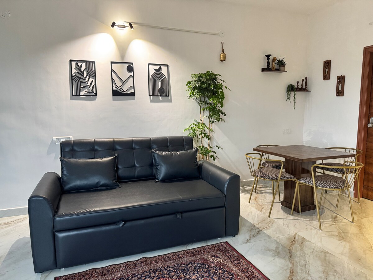 Modern Studio in Bangalore | WiFi • Workspace • Comfort Stay in a calm, stylish studio apartment in Bangalore, thoughtfully designed for solo travelers, couples, and business guests. With soothing blue interiors, premium furnishings, and a dedicated workspace, this studio offers the perfect balance of comfort, productivity, and relaxation. Enjoy a restful night on a comfortable queen-size bed with fresh linen, plush pillows, and a cozy, well-lit ambiance.