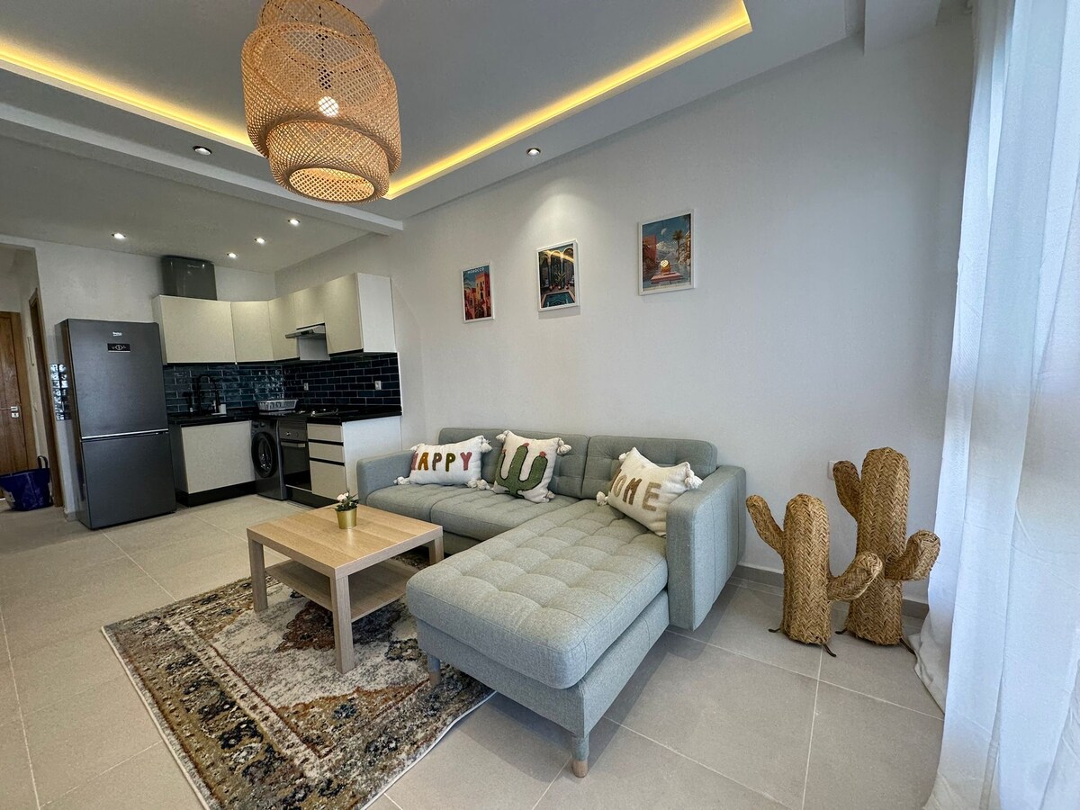 Dobro došli u naš elegantni 2BR Airbnb u Kabo Negru! Za 6 osoba (uključujući bebu) sa kompletnom kuhinjom, brzim Wi-Fi mrežom, 2 pametna televizora, balkonom i osnovnom opremom za porodice (krevetac, stolica za hranjenje). Samo nekoliko minuta od plaže, golfa i 3 velika bazena - idealno za odmor ispunjen suncem, golf izlete ili rad na daljinu. Predivno dizajniran za udobnost, uslugu i opuštanje. Napomena: Zabranjene su zabave, konzumiranje alkohola, pušenje ili nevjenčani parovi prema marokanskom zakonu.