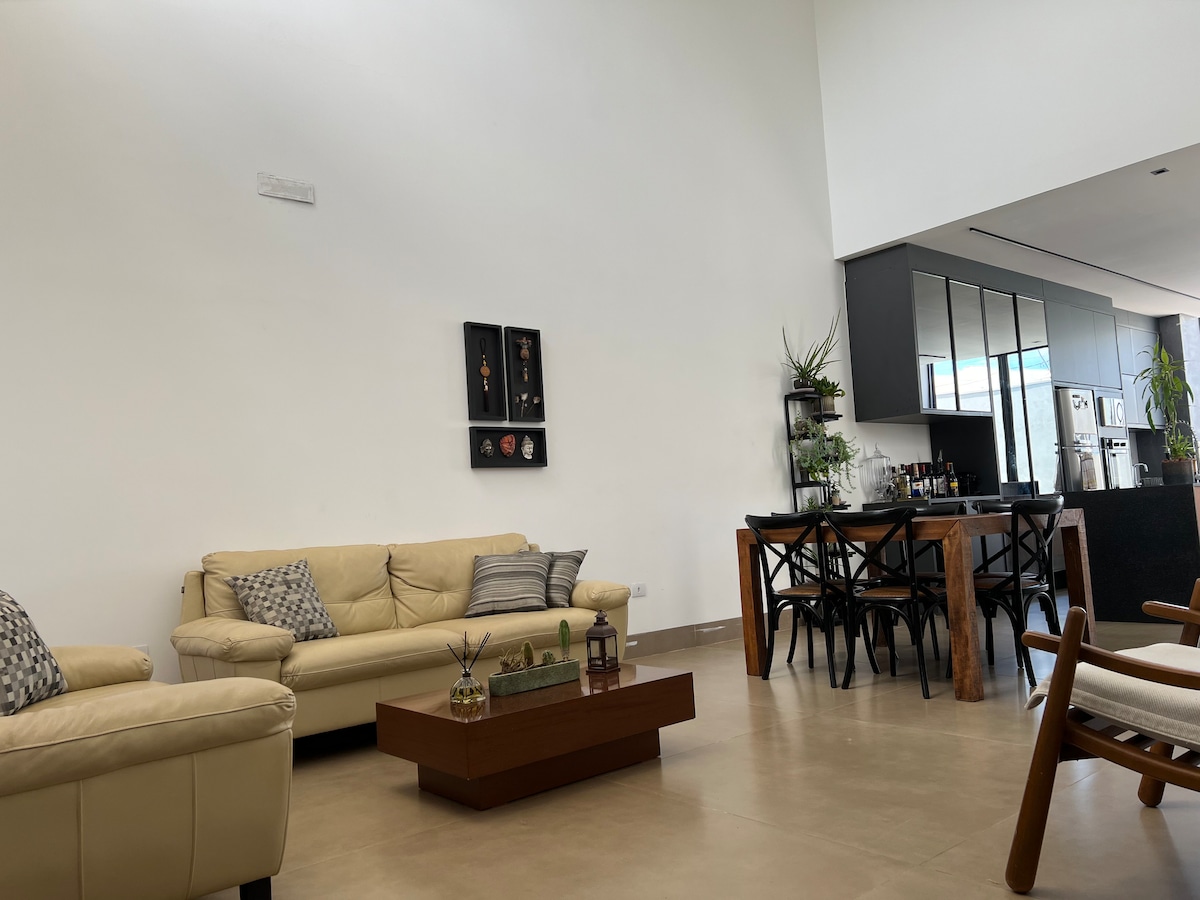 Super House 397 é um sobrado no Jardim Novo Horizonte, próximo ao Bosque 2, que acomoda até sete pessoas. Piso superior: Suíte com hidromassagem, home office e frigobar, quarto de casal e quarto com três camas de solteiro. No térreo: Sala de estar e jantar, lavabo, cozinha, churrasqueira gourmet, banheiro externo e lavanderia Todos os quartos têm ar-condicionado, e a casa conta com Wi-Fi integrado. Nas proximidades: Super Muffato, posto policial, farmácia, posto de combustível etc.