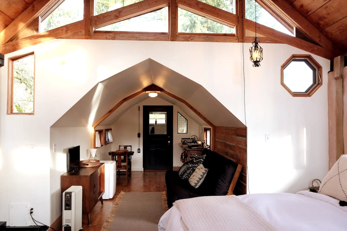 Tiny House Guest Cottage one mile off 213 near Marquam. Remote, yet accessible. 10 minutes from Mt. Angel and Molalla. 15 minutes from Silverton. 18 minutes from Oregon Garden. Loft with King size bed and luxurious sheets. Two sofas downstairs can be converted into beds. Not suitable for children. Sit on the back patio in the evening and listen to owls, coyotes, frogs, and crickets. Dozens of species of birds. I am proud of the reviews guests have left; please read them for more info.