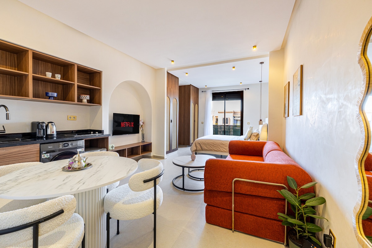 Boravite u srcu Marakeša u našem dvosobnom apartmanu sa 2 kupatila. Uživajte u vrhunskoj posteljini Simmons, brzom Wi-Fi mreži (optičkim vlaknima) i modernom uređenju sa privatnim bazenom. Potpuno opremljena kuhinja, elegantna kada i italijanska tuš-kada. Kratka šetnja od trga Jemaa el-Fna, Plazza i Carré Eden. Bazen nije zagrejan. Napomena: Neoženjeni marokanski parovi nisu dozvoljeni.