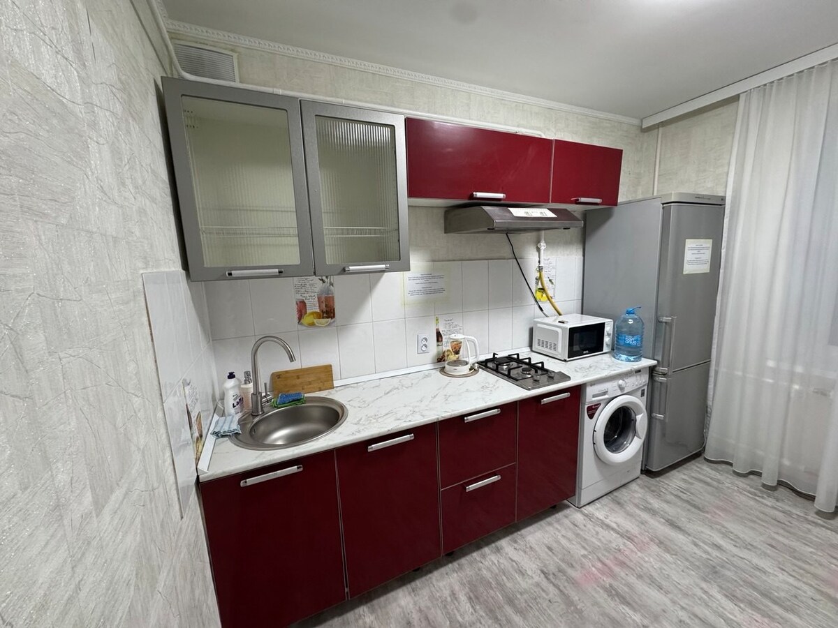 Приглашаем остановиться в нашей светлой квартире с домашним уютом и чистотой в центре города. Для вашего сладкого сна на кровати комфортный матрас с подушками и белоснежная постель. Есть все необходимое для путешественников: фен,аптечка,швейный набор...На кухне вся необходимая бытовая техника, посуда для сервировки и приготовления пищи. Предоставляем командировочные документы.В пешей доступности аквапарк,Храм,Мечеть,клиники,аптеки и пр.В доме есть магазины,салоны и мн.др. Новая детская площадка.