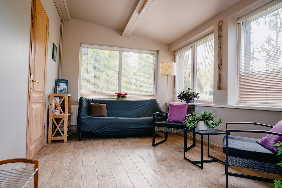 PROČITAJTE KUĆNI RED! Pojedinačni deo kuće u klasičnom stilu Jurmale. Zaseban ulaz. Renoviranje izvršeno 2024. godine. Pješačite do stanice „Vaivari“ 2 minuta, do mora 10 minuta. Bivša letnja rezidencija Narodnog umetnika Letonije Vere Baljuna, gde su se srele poznate pozorišne i filmske poznate ličnosti. Tu je i sauna sa ruskom saunom (uz naplatu), roštiljem i biciklima. Dostupni su rani dolazak i kasni odlazak (uz plaćanje), kao i usluga skladištenja prtljaga (besplatno).