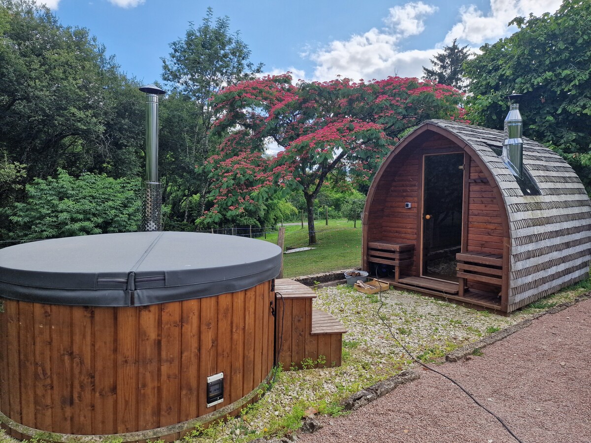 Okrenuta prema šumi i bez susjeda, ova mala kuća je odmor od mira i prirode. Probudite se uz zvuk ptica, uživajte u kafi ispred jutarnje izmaglice, a zatim se opustite u đakuziju zagrijanom na 37–39°C, ljeti i zimi. Uživajte u ukusnim korpama s obrocima ili doručku koji se dostavljaju na vaša vrata. Potpuno isključivanje je zagarantovano, između prirode i apsolutne udobnosti, za jedinstven boravak gdje se čini da je vrijeme stalo.
