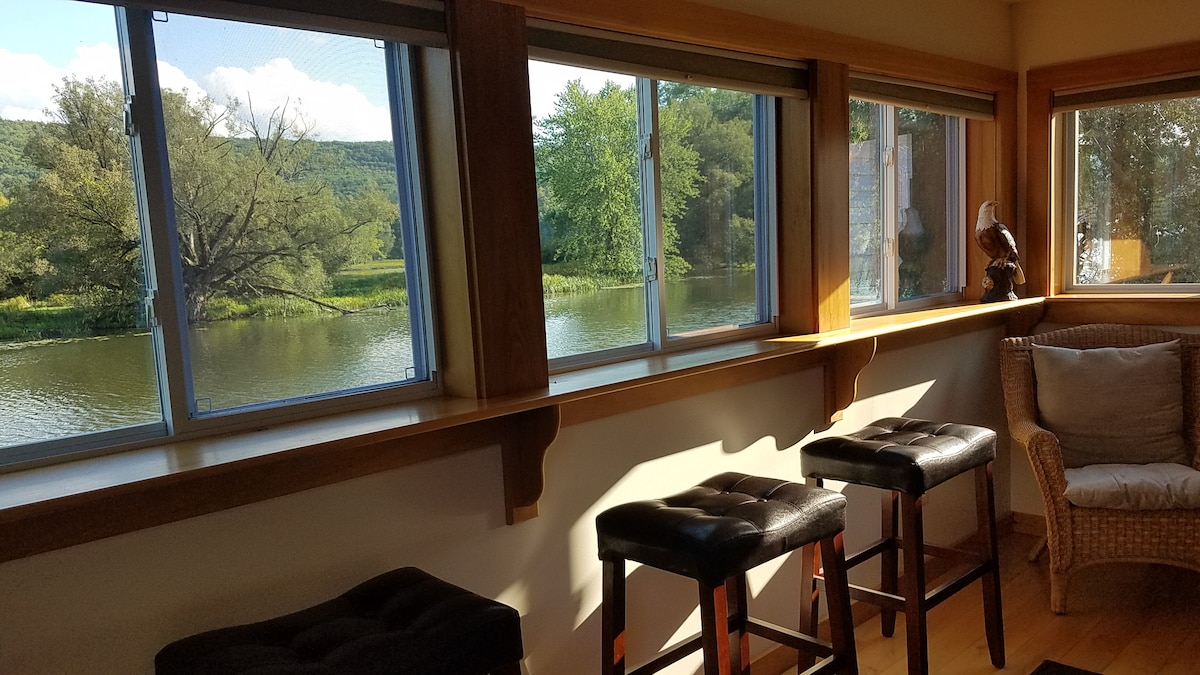 Šarmantna otvorena konceptualna kuća smještena u planinama Ketskil 20 minuta E. od Oneonte. Izuzetni pogledi! (**Pored trkačke staze za motocikle. Nije vidljivo, ali je bučno danju od 9 do 17 sati 4-5 dana.) Uživajte u jutarnjem čitanju u našim udobnim sofama i foteljama ili se udobno smjestite pored plinskog kamina noću. Istražite naš objekat od 20 hektara ili se opustite na širokom, sunčanom travnjaku. Sto i stolice na otvorenom pored ognjišta savršeni su za večernji obrok s pogledom na prelijepe, drevne planine Ketskil.