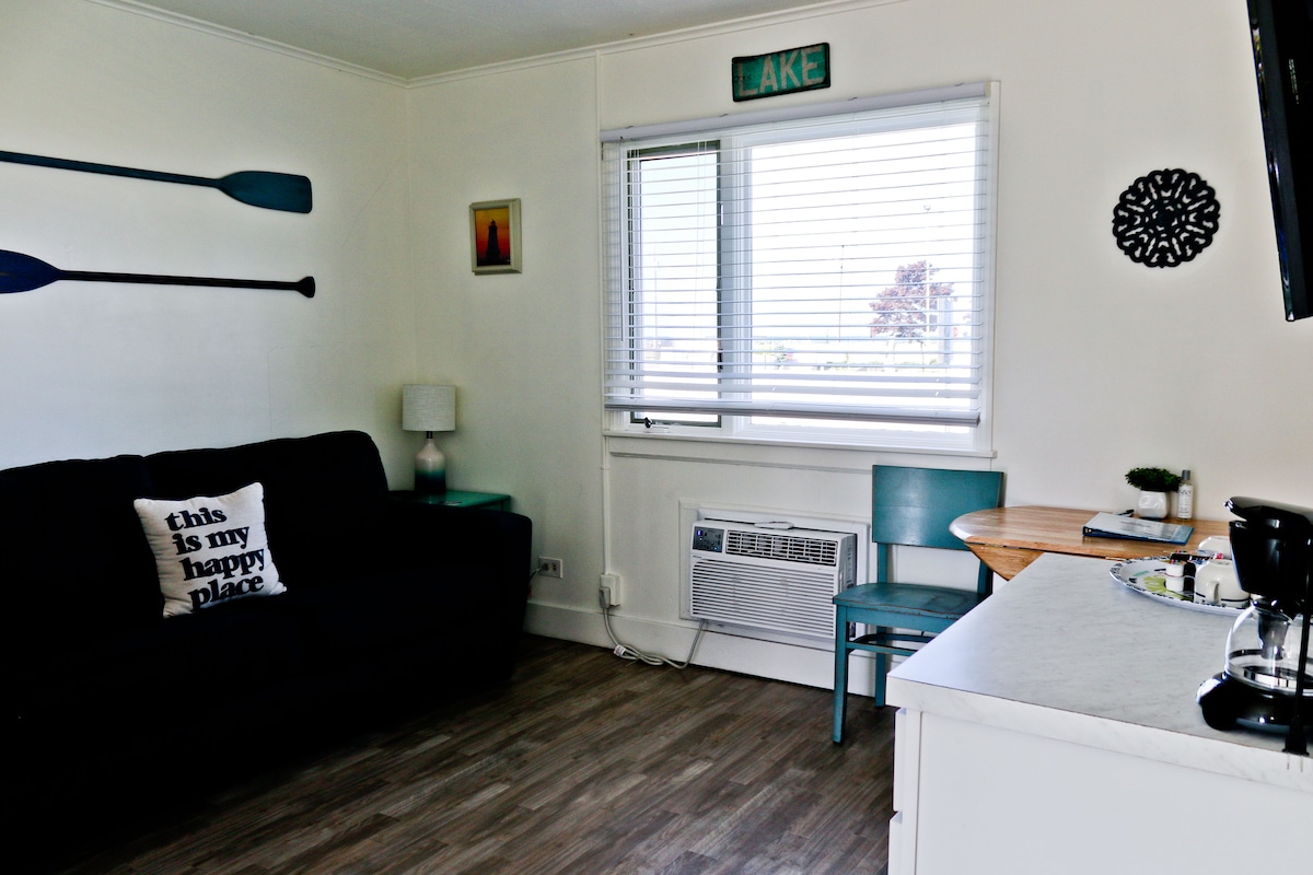 Studio jedinica; Potpuno preuređena zima 2017. godine. Prvobitno je bio klasični motel na plaži iz 1950. godine. Dobro opremljen sa novim luksuznim bračnim krevetom, novim čaršavima, novim televizorom sa ravnim ekranom od 40 inča, odličnim Wi-Fi mrežom, novim frižiderom, novom mikrotalasnom rernom, malim kupatilom iz 1950-ih sa čistom malom tuš kabinom, novim WC-om i novim umivaonikom. Gostima je pod kontrolom grijanja/klima-uređaja, nove boje i novi podovi. Odlična lokacija preko puta Lakeshore Dr. iz nagrađivane plaže Ludington City Stearns, North Breakwall i Lighthouse. Sezonski grijani vanjski bazen. Samo pet blokova od centra Ludingtona sa restoranima, prodavnicama, prodavnicama i muzejom za decu Sandcastles.