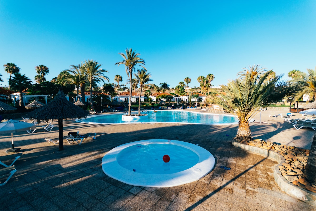 Bungalov se nalazi u vrhunskom području na golf terenu Maspalomas. Područje u blizini čuvenih i rajskih dina Maspalomasa. Potpuno opremljen smještaj sa električnim šporetom, mašinom za pranje veša, mikrotalasnom rernom, klima-uređajem, TV-om i besplatnim Wi-Fi mrežom. Velike zelene površine, 3 bazena, od kojih je jedan grijan zimi, i igrališta. Besplatan parking u području povezanoj sa kompleksom. Idealno mjesto za prekrasan i opuštajući odmor na jugu Gran Kanarije.