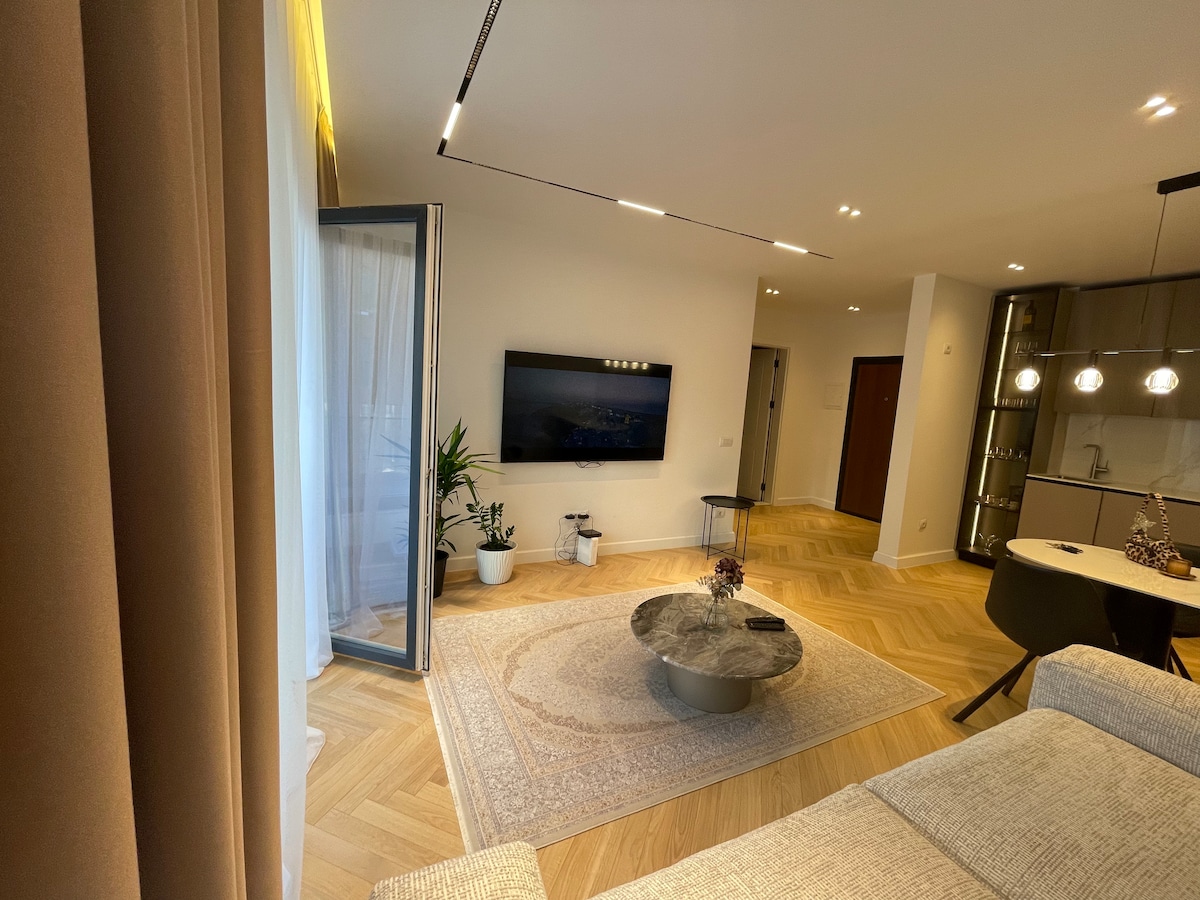 Ruby Apartment je dizajniran u modernom stilu, kombinujući eleganciju i udobnost. Unutrašnjost ima čiste linije, neutralne tonove i pažljivo odabrani savremeni namještaj. Veliki prozori omogućavaju da prirodno svetlo preplavi prostor, stvarajući svetlu i prijatnu atmosferu. Svaki detalj je pažljivo osmišljen, od minimalističkog uređenja do visokokvalitetnih materijala, koji nude elegantan, ali udoban životni doživljaj. Idealno za one koji cijene modernu estetiku i funkcionalan dizajn.