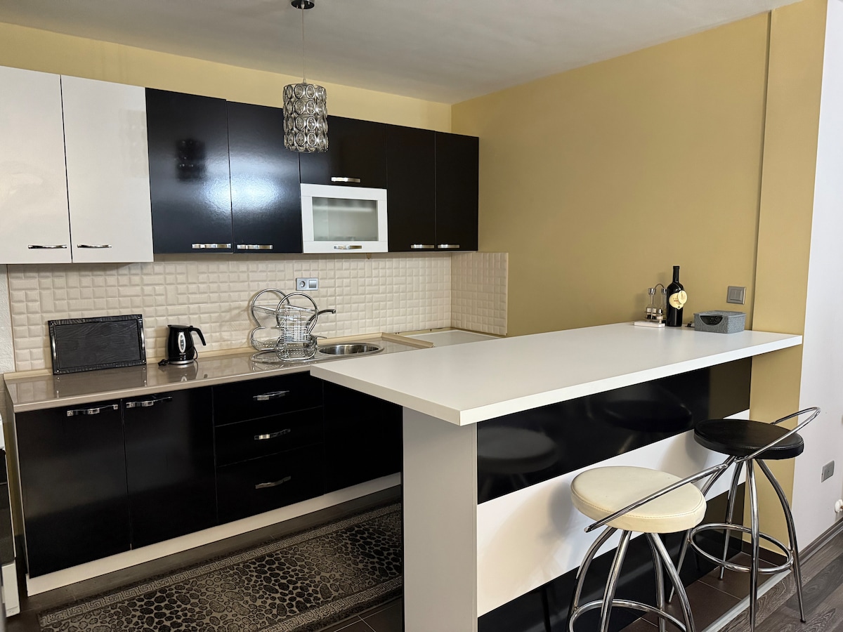 Moderan i luksuzan stan sa 2 spavaće sobe, prostranim dnevnim boravkom sa 60-inčnim Smart TV-om, potpuno opremljenom kuhinjom, modernim kupatilom i opuštajućim balkonom. Nalazi se u srcu Prištine, na samo 5 minuta hoda od glavnog trga. Brzi Wi-Fi, klima-uređaj i besplatan parking čine ovaj smještaj idealnim za najviše 4 gosta, što je savršeno i za odmor i za poslovne boravke.