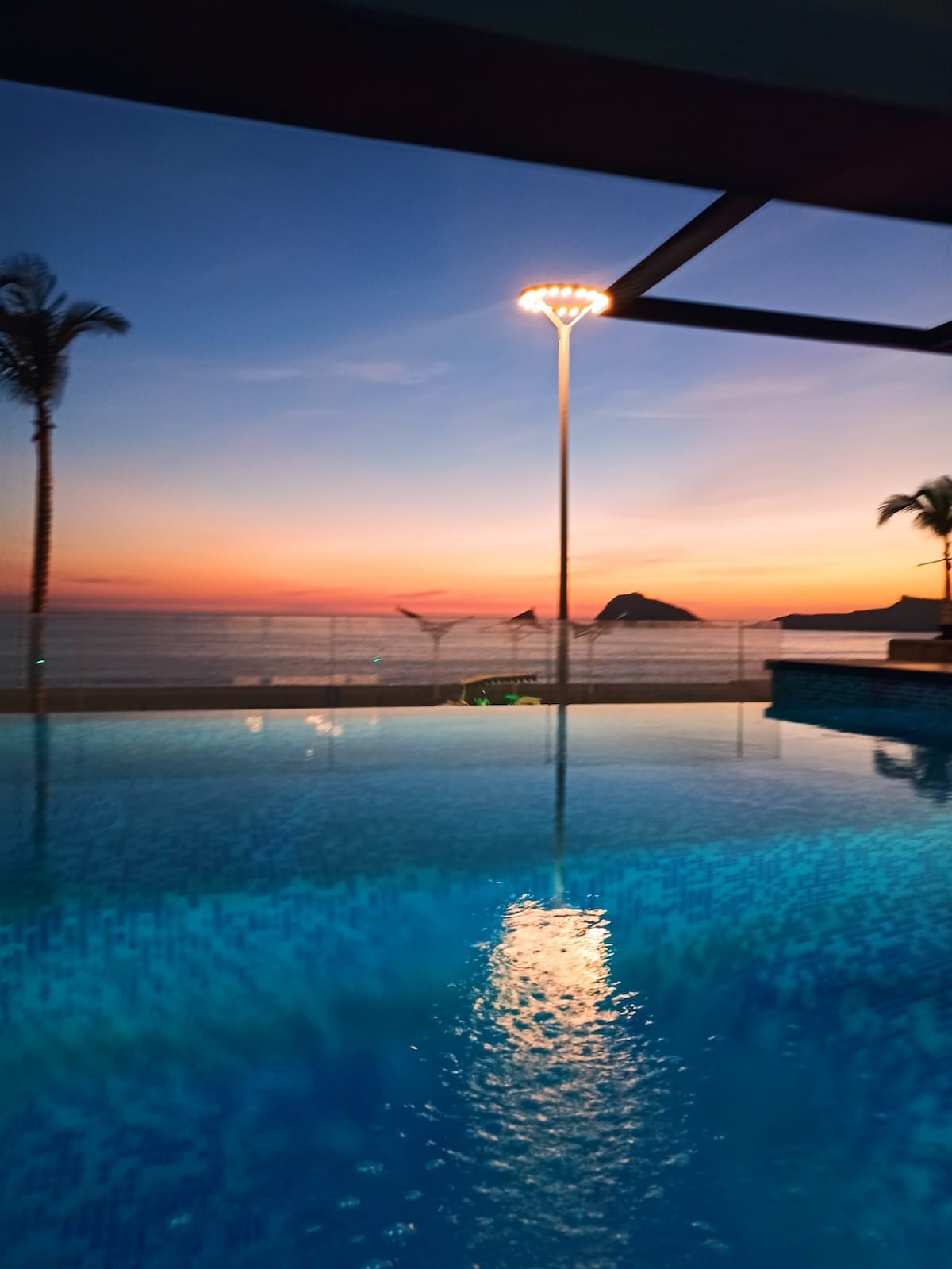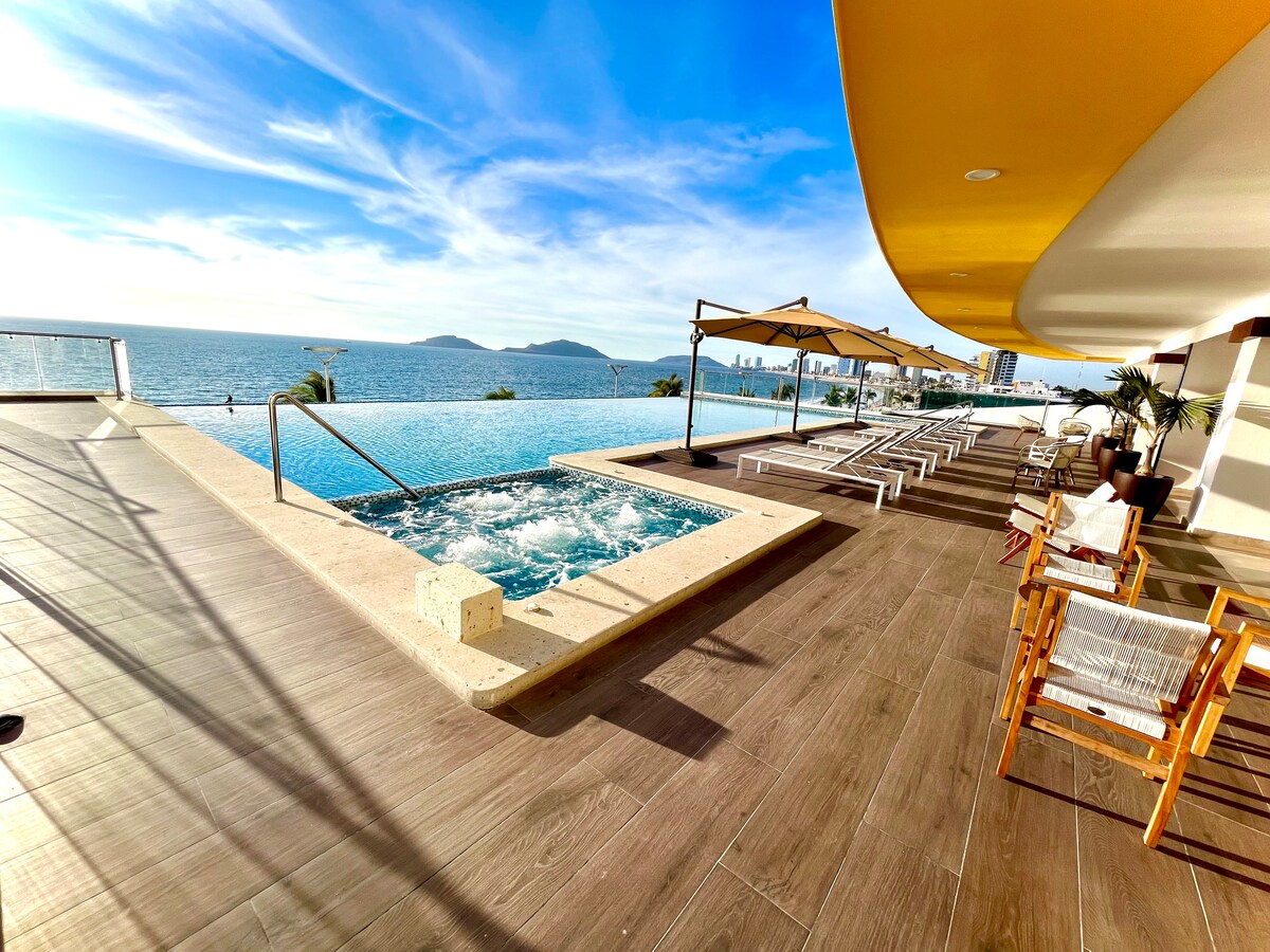 El condominio es muy seguro y cuenta con amplios espacios en todas sus áreas, ubicado justo frente a la playa, sobre el malecón (lugar donde se realiza el icónico carnaval); Al estar ubicado en un nivel Quince, se puede disfrutar de una hermosa vista y de los hermosos atardeceres que junto a las 3 islas nos brindan una experiencia inolvidable. La Playa ubicada al frente cuenta con palapas con variedad de mariscos, pescados y otras especialidades locales, así como refrescantes bebidas.