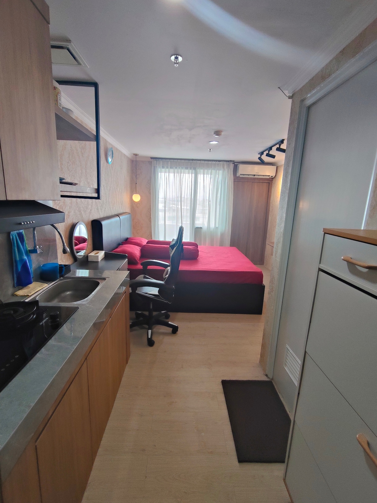 Nedavno renovirani stan Podomoro Siti Deli Medan Nudi luksuzan boravak sa udobnim i domaćim dizajnom. Naći ćete očaravajući predivan pogled na grad direktno iz udobnosti vašeg prozora i balkona. Nalazi se u centru grada Medan. • Direktan pristup tržnom centru Podomoro direktno iz predvorja stana • Nasuprot hotelu JW Marriot • Ned i CP 8 minuta • Veoma lep pogled na grad • Potpuno namješten Lux • 2 jedinice Big Smart TV (sa Netflix-om, YouTube-om itd.) • Brzi Wi-Fi • Prečišćivač vazduha