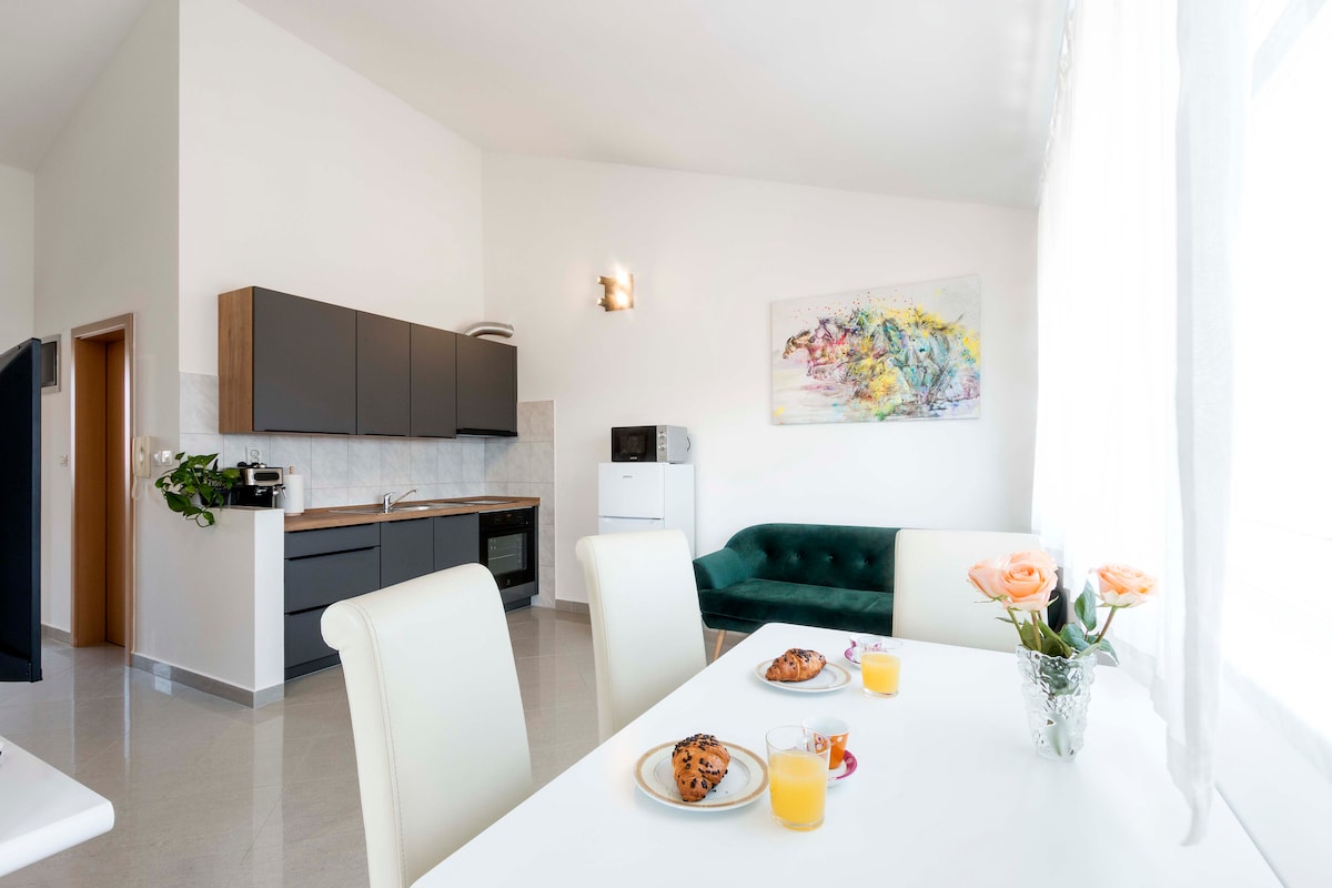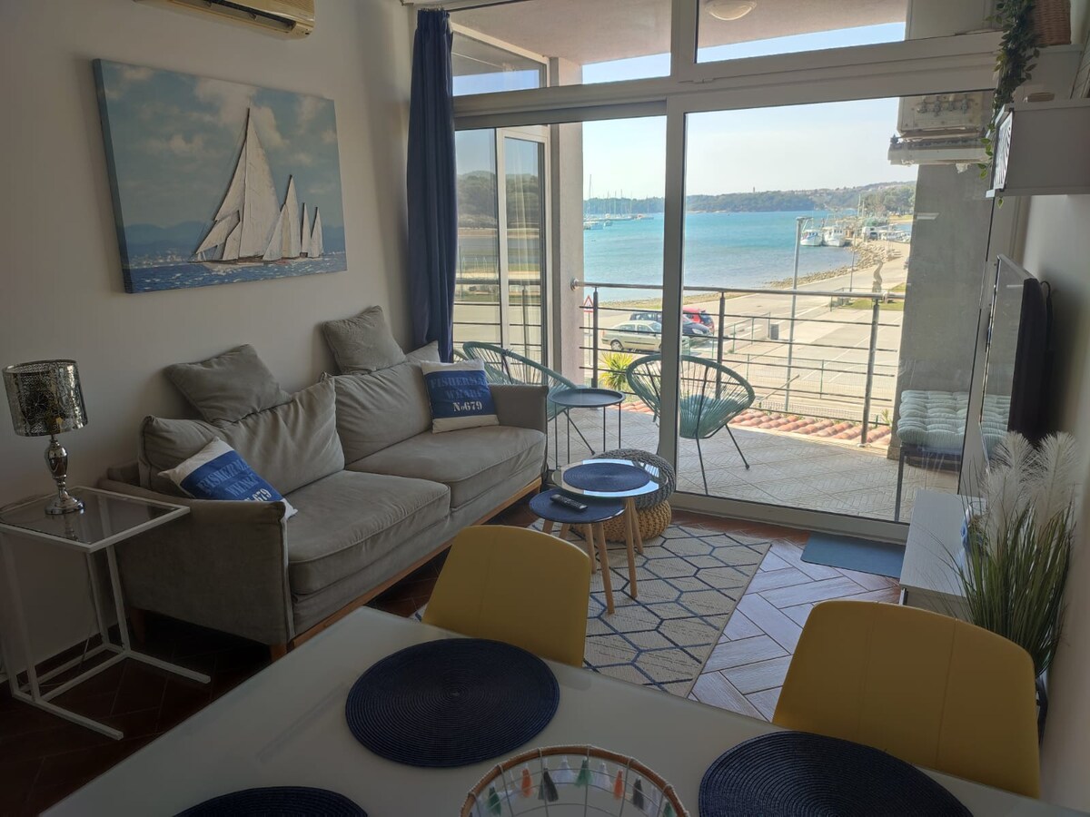 This charming apartment is suitable for younger guests, digital nomads and cycling fans as it offers a garage for bikes. It has a beautiful sea view with three balconies. It is located on the second floor (attic), so it is not suitable for guests with mobility problems due to the circular stairs. Distance from the seacoast is 250 m, and from the sandy beach 1000 (15 min walk). The nearest restaurant is 50 m away. Market "Stanić" , butcher, bakery 250 m, large markets: Lidl and Plodine 600 m.