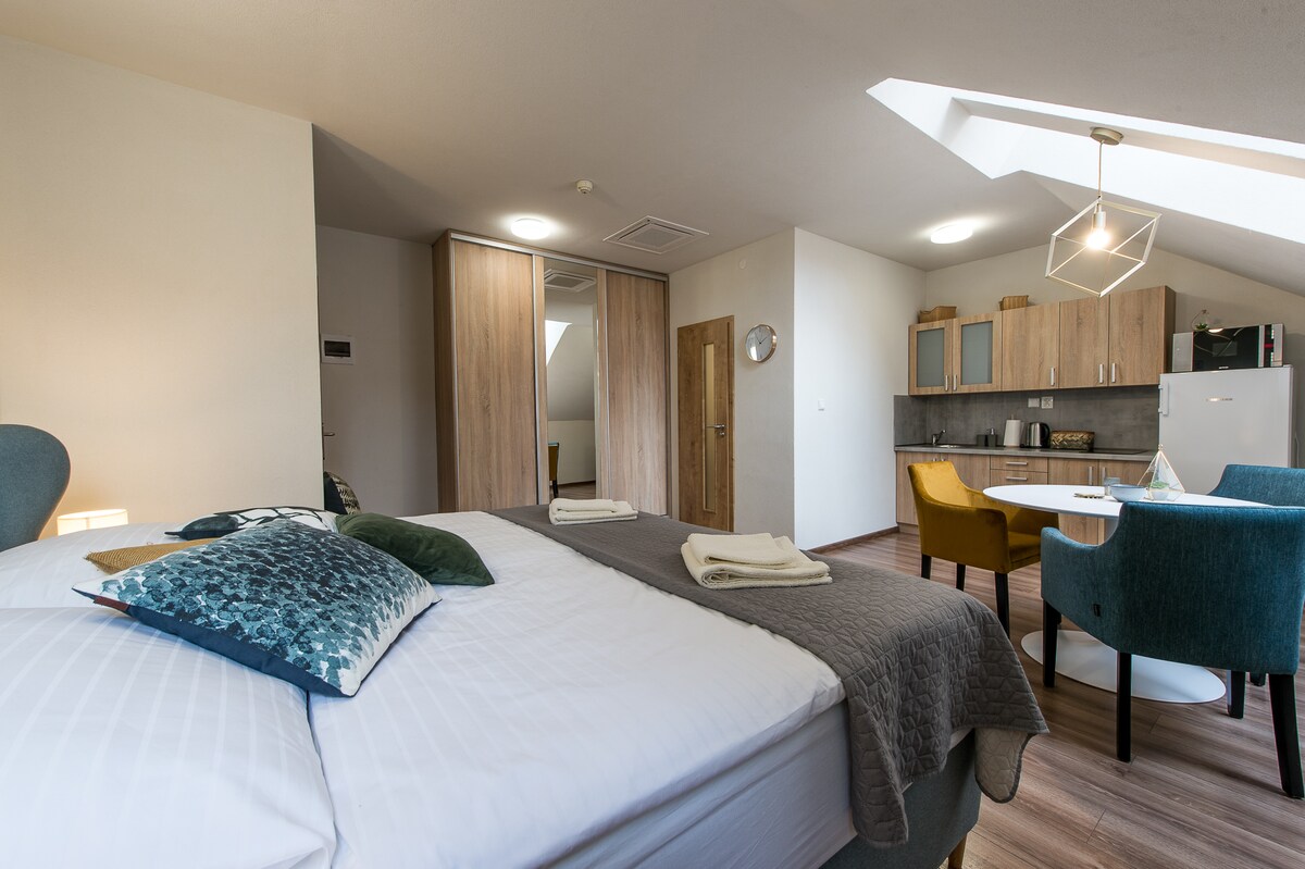 Doživite šarm istorijskog Prešova u svijetlom i luksuznom stanu u samom srcu grada. Bez obzira na to da li dolazite zbog romantike, posla ili opuštanja, imaćete hotelsku udobnost, privatni unutrašnji parking, brzi Wi-Fi, Netflix i elegantan enterijer samo nekoliko koraka od središta zbivanja. Osnovna cijena je za 2 osobe. Svaki dodatni gost +12 € po noćenju, besplatna beba. Smještaj je za *1-4 gosta** (spavaća soba sa krevetom od 180 cm i dnevna soba sa sofom od 140 cm). Pristup bez stepenica - lift.