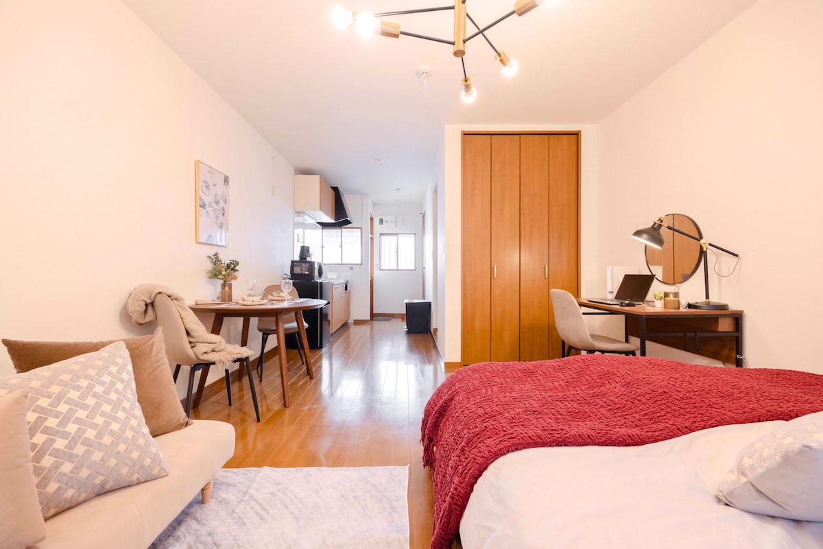 Boravite u srcu Tokija u opuštenoj atmosferi! Upravo renoviran stan za one koji vole dizajnirane hotele ili stanove. Ima 45m2, dva kreveta za jednu osobu i jedan dodatni dušek, široku sofu za opuštanje. Sav rustikalni i održivi drveni namještaj napravljen u Jokohami. Kupatilo i WC su odvojeni. Ima raznih restorana i barova, ispred su dva minimarketa koji su otvoreni 24 sata. Takođe, domaćin je od pomoći jer živi u istoj zgradi.