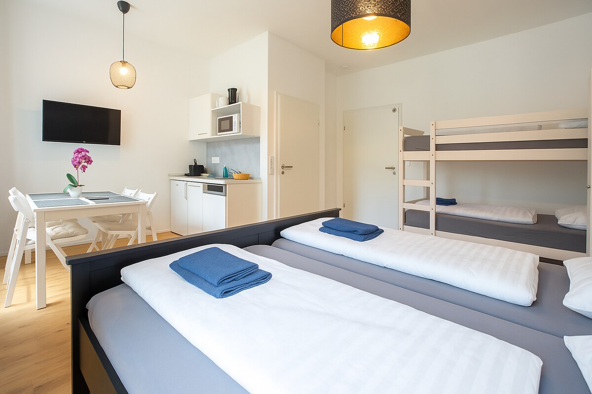 Šarmantni klimatizovani stan u staroj zgradi na 1. spratu, idealan za 2-4 osobe. Prostrana spavaća soba s krevetom s oprugama, kutkom za čitanje u prozoru i radnim stolom. Dnevni boravak sa trpezarijom, kaučem na izvlačenje i TV-om. Dobro opremljena čajna kuhinja, veliki trpezarijski sto i engleski namještaj. Moderno kupatilo sa tuš kabinom i mašinom za pranje veša. Zaseban toalet sa slavinom za tuširanje.