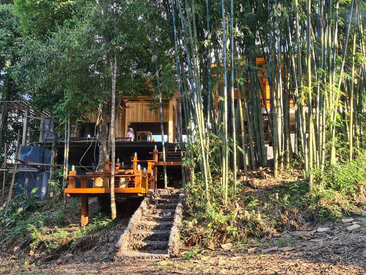 Glampovanje u šumi od bambusa na platformi od 55m² koja nudi privatni klimatizovani šator, privatno kupatilo u dvorištu, terasu i baštu koja redefiniše eko-luksuznu udobnost. Udobna garnitura za sjedenje na otvorenom. Ukusan namještaj, prostrani bračni krevet (bračni krevet na zahtjev), domaći organski čajevi, mini bar. Doživite eko-luksuzno glampovanje pod zvijezdama uz zvukove i tišinu rijeke i šume bambusa kako biste mogli da spavate.