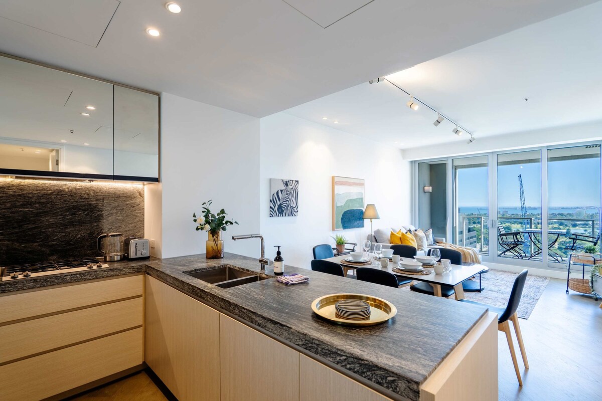 🌟 „Jedan od najčišćih Airbnb smještaja koje sam ikada iskusio, besprijekorno čist i dobro održavan” Opustite se na udobnom kauču i uživajte u veličanstvenom pogledu na CBD u Melburnu kroz prozore u uglu od poda do plafona. Prostor je uređen u neutralnim tonovima, pozajmljujući elementi skandinavskog i japanskog dizajna. Popijte jutarnju kafu na tajnom balkonu pored spavaće sobe.