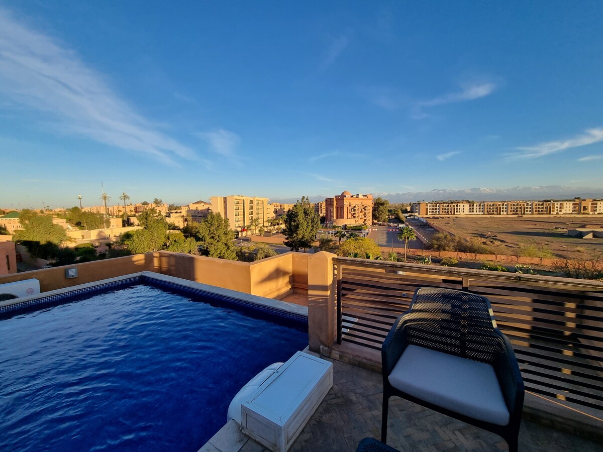 Uživajte u udobnosti ovog prelepog apartmana, u srcu Marakeša u zimskom okrugu. Dizajn, udobnost i izuzetno funkcionalan, sa bazenom na krovu, za jedinstveno iskustvo daleko od svakodnevice. Ovaj biser apartmana savršeno je mirno mjesto za vaš odmor u srcu Marakeša. Internet optička vlakna 100 mega IZNAJMITE BEZ RAZMIŠLJANJA. Napomena: Marokanski ili mešoviti par, mora da predoči VENČANI LIST PO DOLASKU