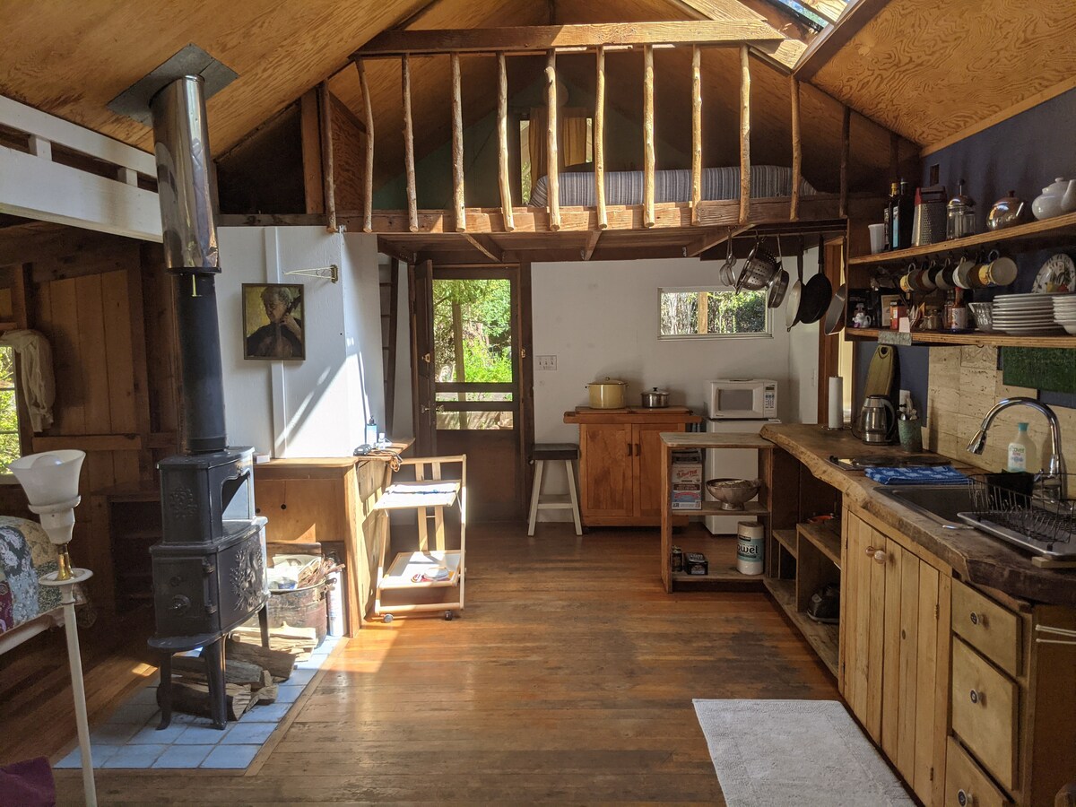 Utočište na kraju privatnog puta u šumi sekvoja, prirodnom šumskom zemljištu i Julietinoj dugoj voljenoj bašti. Stolar/Muzičari/Lokalni umetnici izgrađena brvnara sa mnogo prirodnog drveta i svetla. 15 minuta do Mendocino „pravilno“; 5 minuta do luke Albion; 10 minuta do državne plaže Navarro; 6 minuta do staze Navarro Headlands. Mnoge druge odlične šetnje u blizini - i od objekta. Noćno nebo ispunjeno zvijezdama i šumom Pacifika na samo nekoliko minuta nizbrdo. Povlačenje. Rekreacija. Ili radite (jak Wi-Fi) daleko...