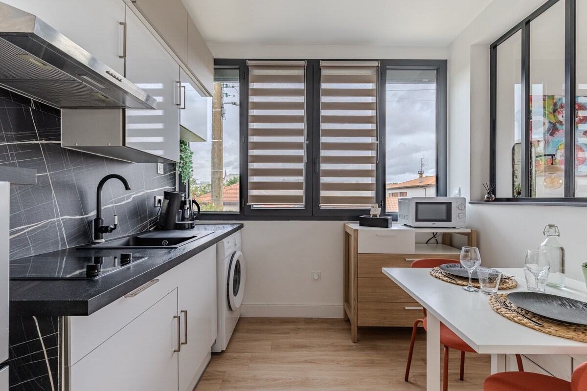 Dođite i provedite boravak u ovom slatkom 38 m2 T2 u Mérignac! Posebnosti? - Terasa od 12 m2 sa prostorom za opuštanje i trpezarijskim stolom. - Njena lepa, potpuno opremljena kuhinja sa mašinom za sudove. - Kupatilo sa mašinom za pranje veša. - Nalazi se u blizini Bordoa, 14 minuta od mesta Gambeta autobusom. - Privatno mesto za parkiranje. - Posteljina (peškiri, posteljina). - Nema naknada za čišćenje: Zauzvrat, smeštaj se mora vratiti čist i uredan