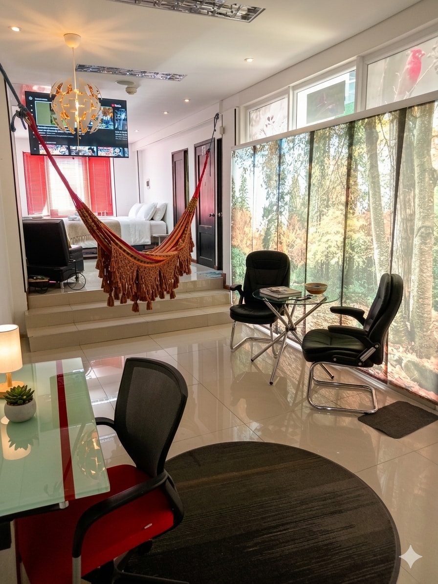 Despierta con los Cerros Orientales frente a ti. Nuestro loft está ubicado en el edificio más icónico de Chapinero, una torre de vidrio que captura la ciudad desde todos los ángulos. El apto combina diseño, amplitud y luz natural en un solo espacio. Ventanales de piso a techo, terraza privada, wifi de 600 Mbps y zona de trabajo para quienes mezclan viaje con productividad. Afuera, todo Chapinero a pie: Parque de los Hippies, Carrera7, restaurantes de autor, cafés de especialidad y vida nocturna.