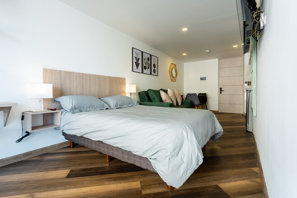 Šarmantni apartman u srcu četvrti Bgtá, idealan za parove ili putnike. Elegantan dekor, opremljena kuhinja i udoban bračni krevet. Privatni balkon s pogledom koji oduzima dah, društveni prostori kao što su Lavado Area, teretana, bilijarski sto i stoni tenis, CoWo, terasa za roštilj na gornjem spratu s pogledom od 360° i 24-satno obezbjeđenje. U blizini pijaca, muzeja, restorana u La Macareni, Monserrate, La Candelaria, Mall San Martín i Centro Internacional. Otkrijte ono najbolje od Bogote iz ovog predivnog odijela!