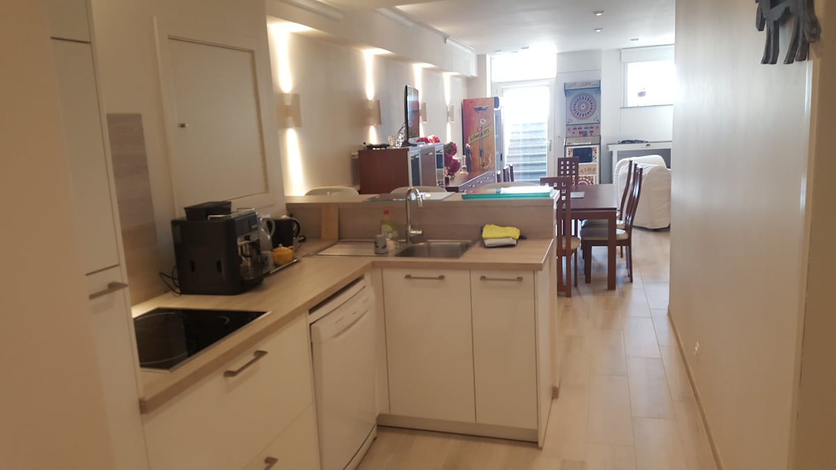 IMPORTANT Le logement est situé dans le sous-sol d une charmante villa de la belle époque une vaste salle polyvalente permet le couchage pour 8 personnes. Le logement est équipé d un billard . A votre arrivée vous trouverez les lits faits et des serviettes de bain vous attendent à la salle de bain. La cuisine est équipée d un lave vaisselle, d un micro onde, d un frigo, d une taque de cuisson électrique, cafetière électrique, bouilloire . Accès du logement sur la digue de mer.